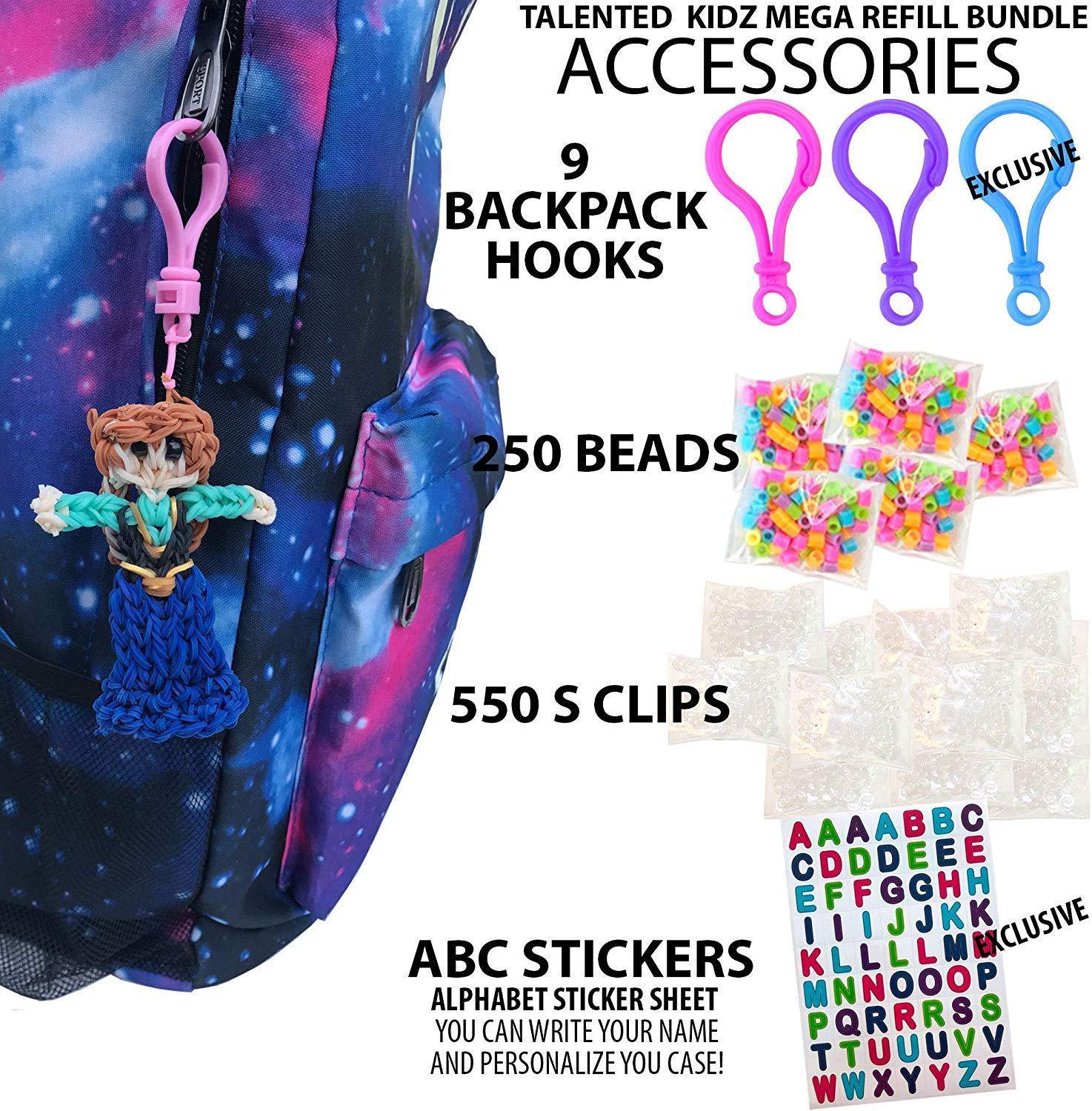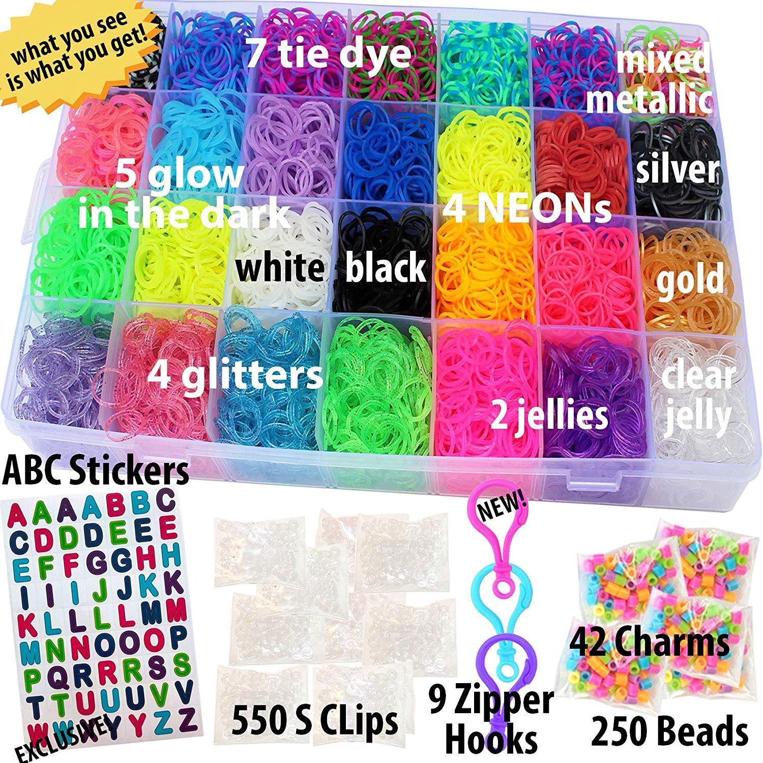 THE LARGEST ASSORTMENT , AUTHENTIC. 11,750 pieces Mega Bundle: Over 10,750 premium quality rainbow rubber bands + 9 Zipper Hooks + 200 Beads + 550 S-Clips + ABC Stickers + DIY Personalized Case Organizer. WHAT YOU SEE IS WHAT YOU GET! Over 2.4 pounds of premium rubber bands and accessories. THIS IS A REFILL CASE, NO LOOM IS INCLUDED