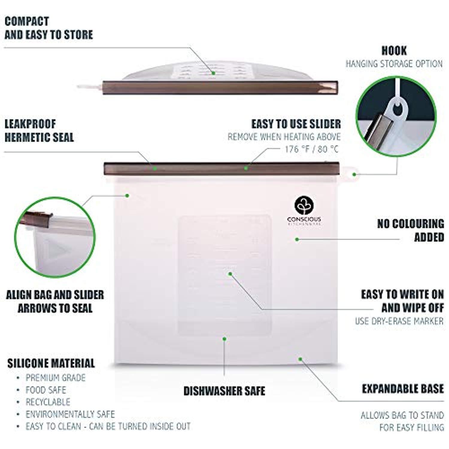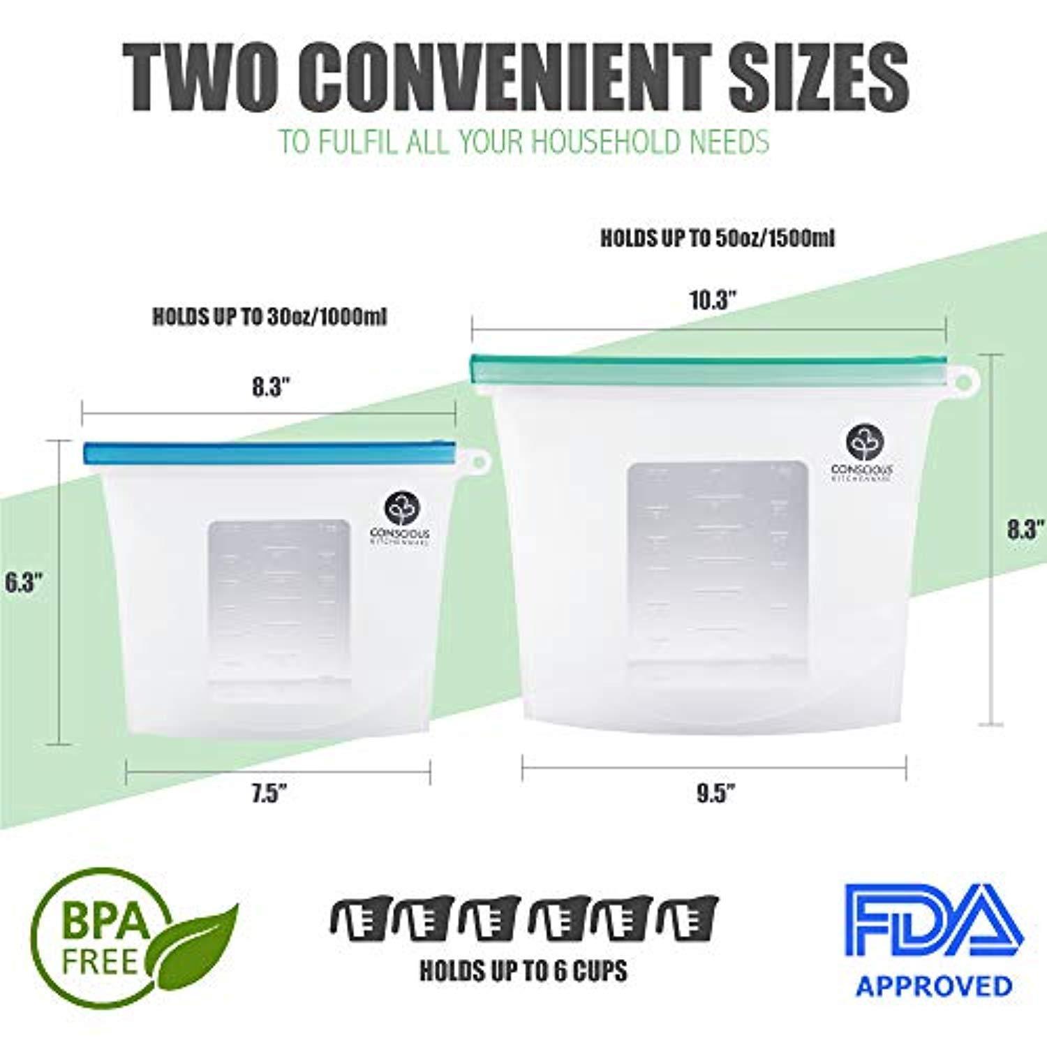 Conscious Kitchenware Eco Friendly Reusable Silicone Food Storage Bags 1x Large 50oz + 3x Small 30oz - Airtight Seal Keeps Food Fresh - FDA-Approved Reusable Snack, Sandwich, Sous Vide & Freezer Bag