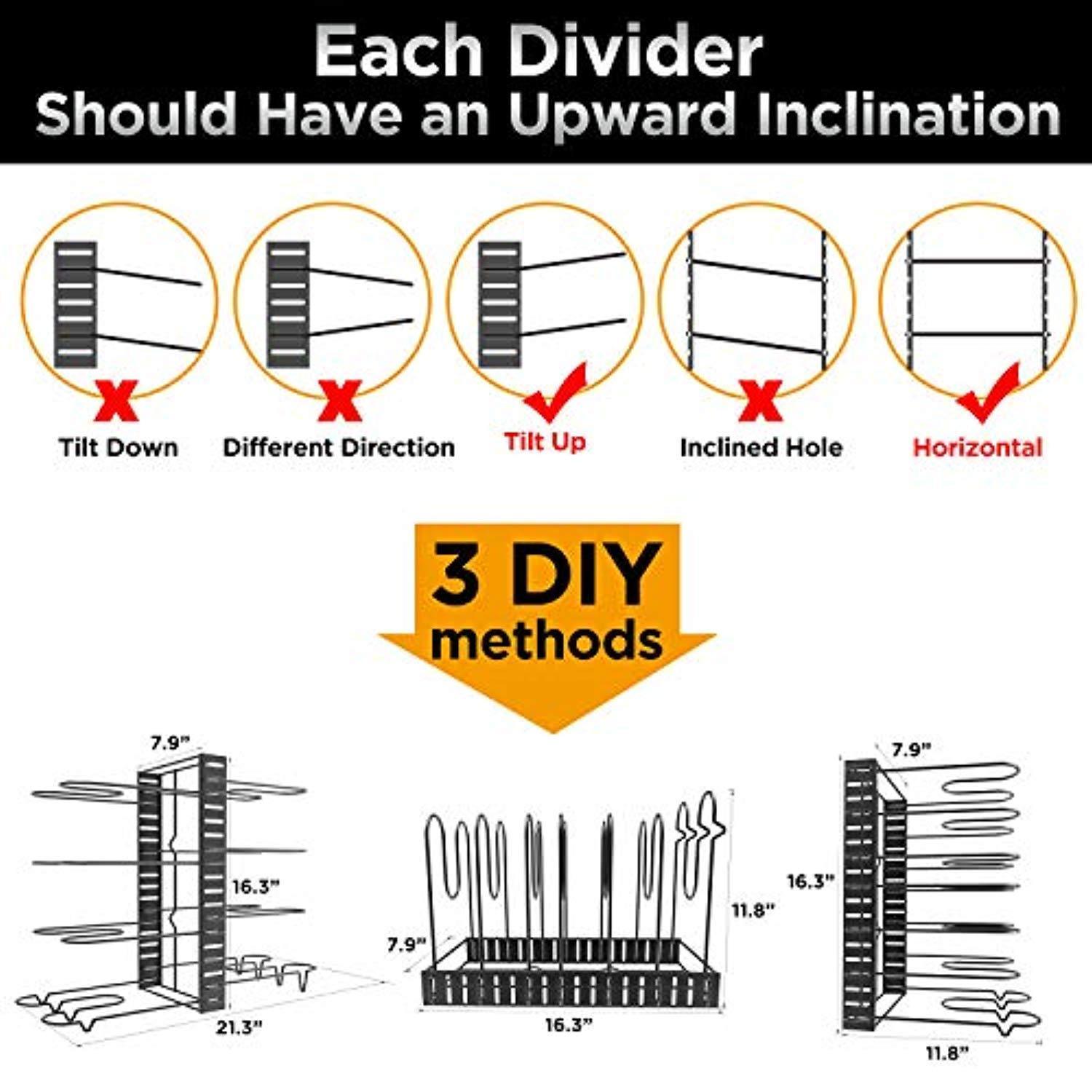 [TWO Installation Modes] There are two unique designs for installation methods. The pot lid rack coming with 8 adjustable tiers, you can either install 8 tiers on one side of the pan rack or install 4 tiers on both sides of the pan rack.