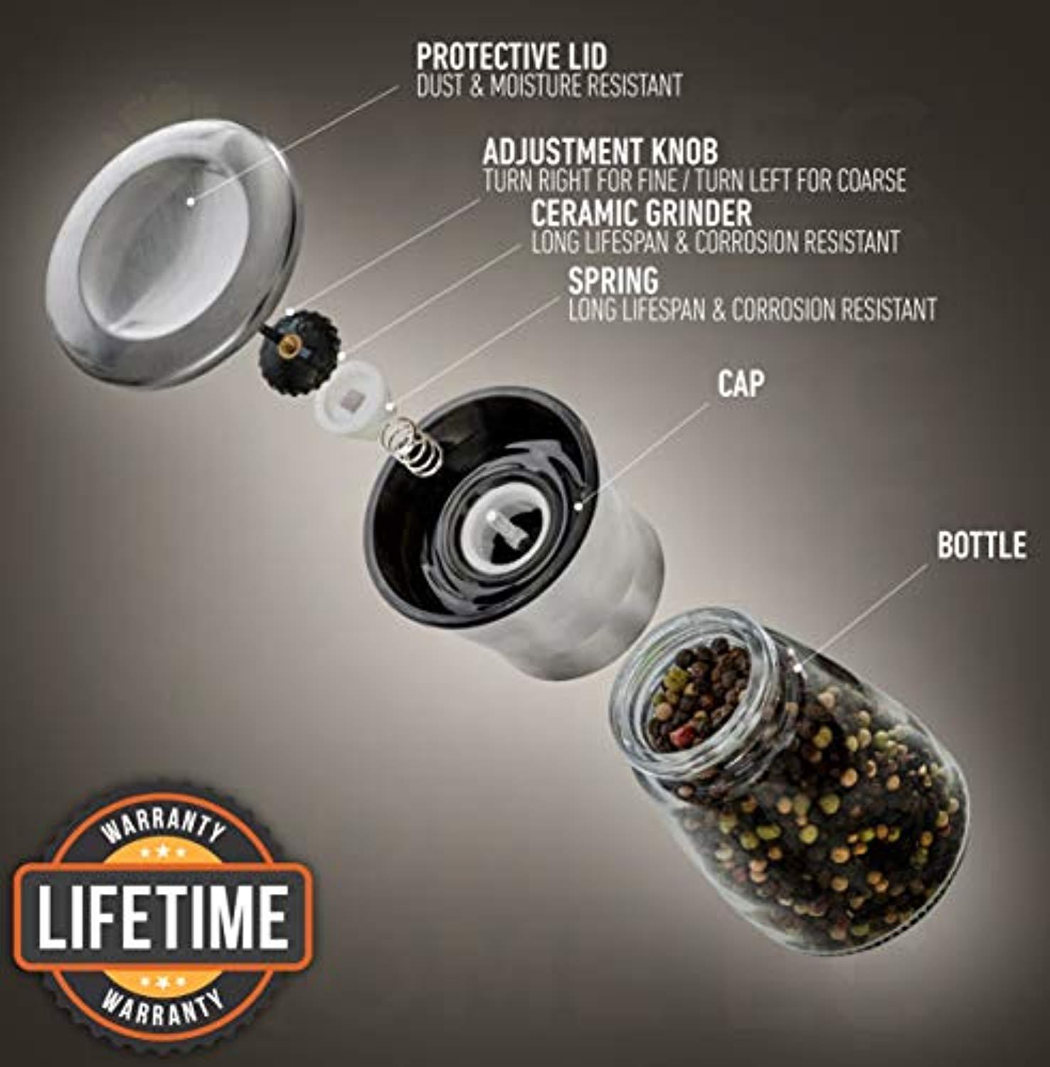 Premium Stainless Steel Salt and Pepper Grinder Set of 2 - Adjustable Ceramic Sea Salt Grinder & Pepper Grinder - Short Glass Salt and Pepper Shakers - Pepper Mill & Salt Mill with Free Funnel & EBook