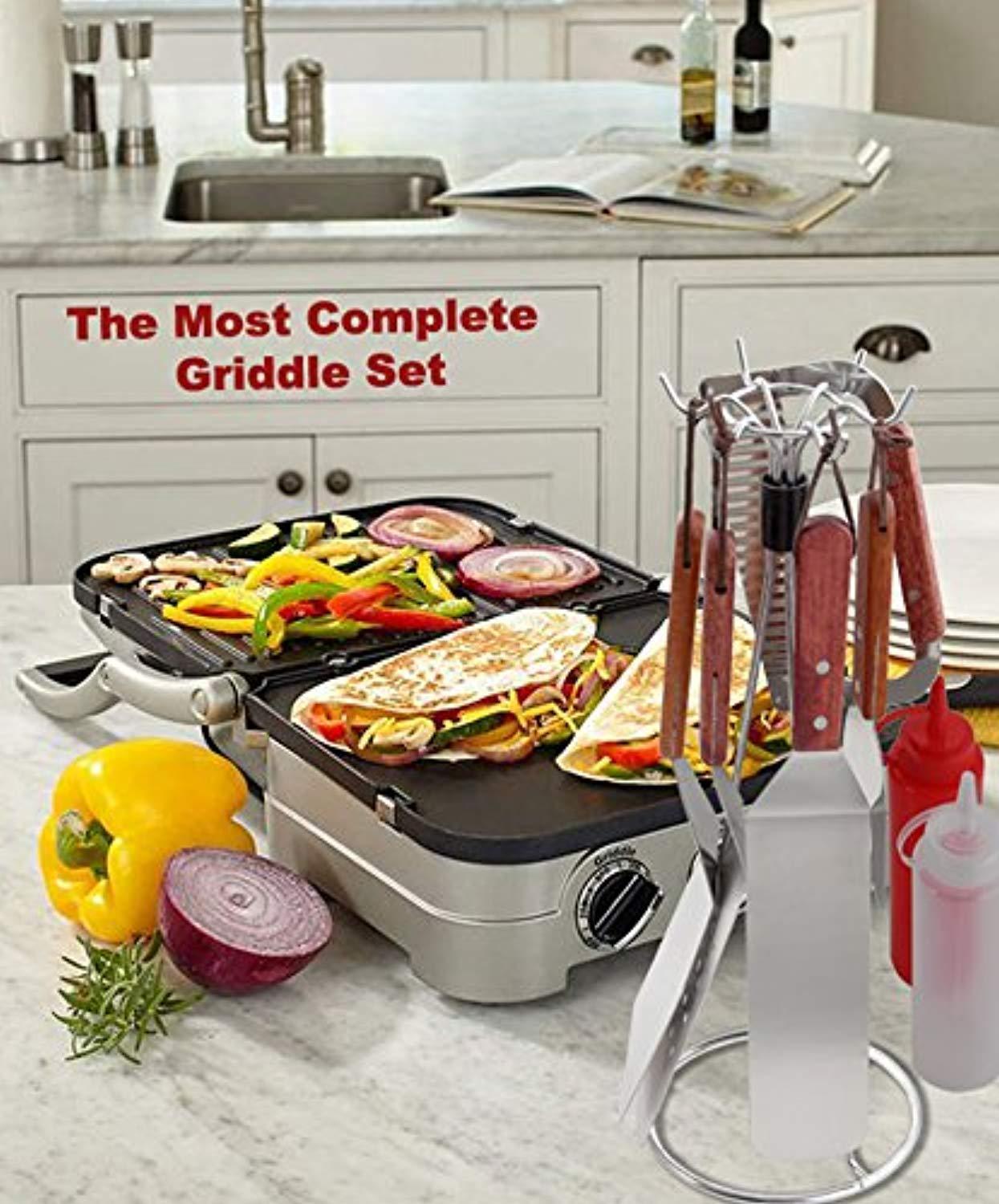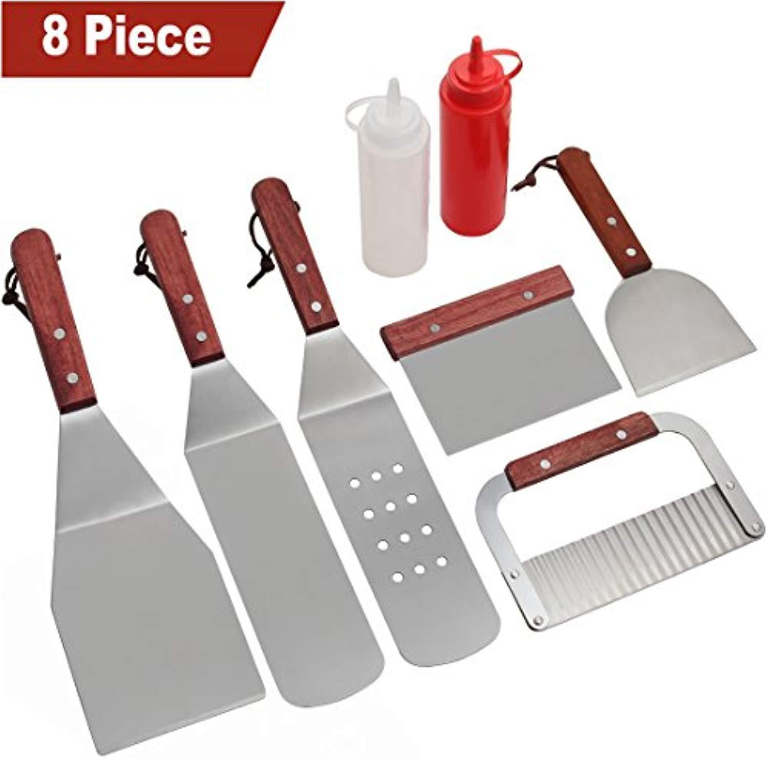 Exclusive Griddle Cooking Set - Complete griddle set for various cooking uses comes with 2 spatulas, flipper, scraper, chopper, wavy cutting tool, 2 bottles.