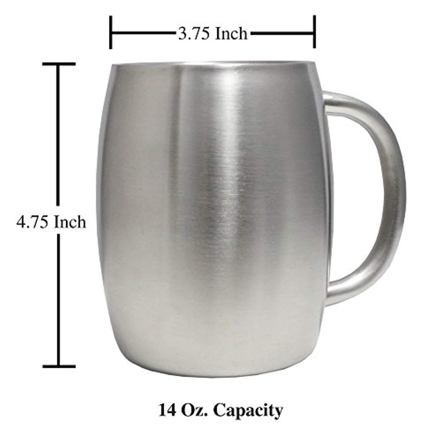 COMFORTABLE AND ELEGANT - The metal mugs have an attractive curved shape that is pleasing to the eyes. A welded ergonomic handle stays securely attached and allows users to fit 4 fingers comfortably. The mug has a flat, stable bottom that sits flush on counter and table tops.