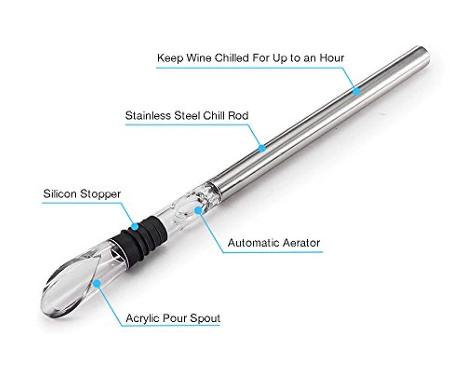 EASY AND FLEXIBLE TO USE - Unscrew and place the stainless steel chill rod in the freezer for a few hours; Open a bottle of wine, pour out some wine in another glass (to prevent spilling); Attach stainless steel rod to pourer; Place assembled chiller stick into wine bottle ; Then serve and enjoy your vino! * If you don't want to chill your wine, just use the pourer and aerator.