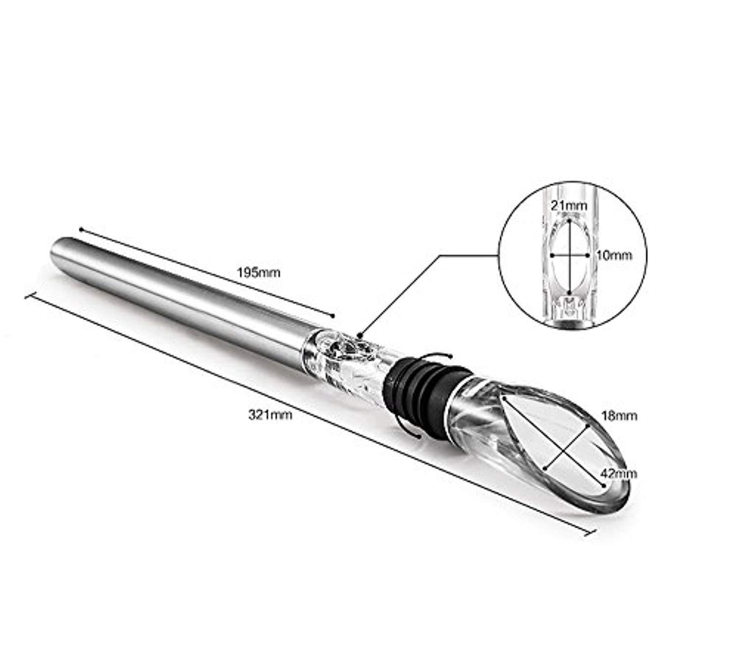MULTI-FUNCTIONAL SPACESAVING DESIGN - 3 useful devices in 1 sleek package: wine pourer, wine aerator, & wine chiller. Measures 12.6 in x 1 in, weighs 3.8 ounces & fits all standard wine bottles
