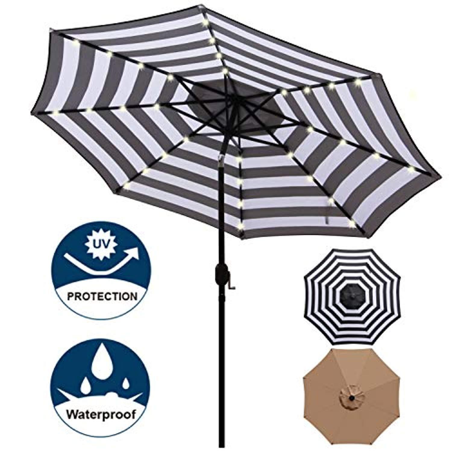 ☂☂【Energy-Efficient Lighting】4 LED lights on each rib, 8 steel rib construction, solar-powered 32 LEDs provide energy-efficient lighting, help to light up relaxing night and create warm atmosphere. Overall Dimensions: 108"(Dia) x 98.4"(H); Dia.1.50 inch (38 mm) Pole for stronger support and durable Push Button Connector (NOTE: Umbrella BASE NOT Inluded) ☂☂【Easy Tilt Operation】On and off switch for umbrella solar light, easy tilt operation with push button for more angles with hand-crank lift, easy set-up and take-down so you can relax within seconds. ☂☂【TILTS TO BLOCK SUNLIGHT】Breathable fabric that blocks up to harmful UV rays and guards against water and mildew, long lasting, fade resistant, mold and mildew resistant. Provide a perfect shade for your patio, garden, deck, backyard, pool.