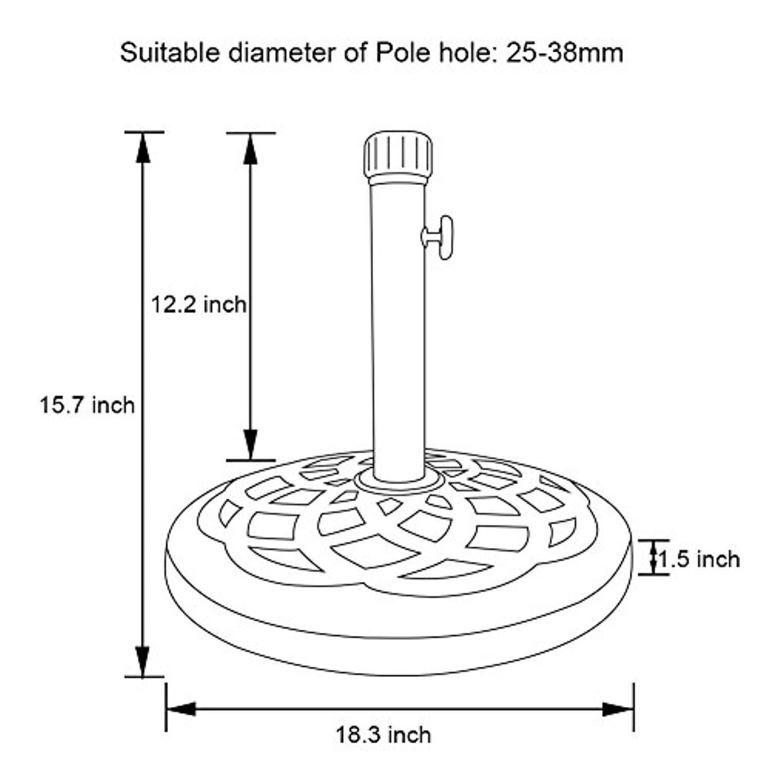Equipped with adjustable piston, a wide range of application, can be adjusted according to the thickness of the umbrella column.Umbrella Pole Diameter Range:φ0.75" - 1.5" Apply for family, villa, hotel, terrace, balcony, resort, water park, barbecue bar, western restaurant, beauty salon, outdoor leisure area, company leisure area, company rest area, etc. For matching umbrellas,please search B07B5426Y9, B07B62ZT3N, B07BLTF37K and B07BLXYBKW.