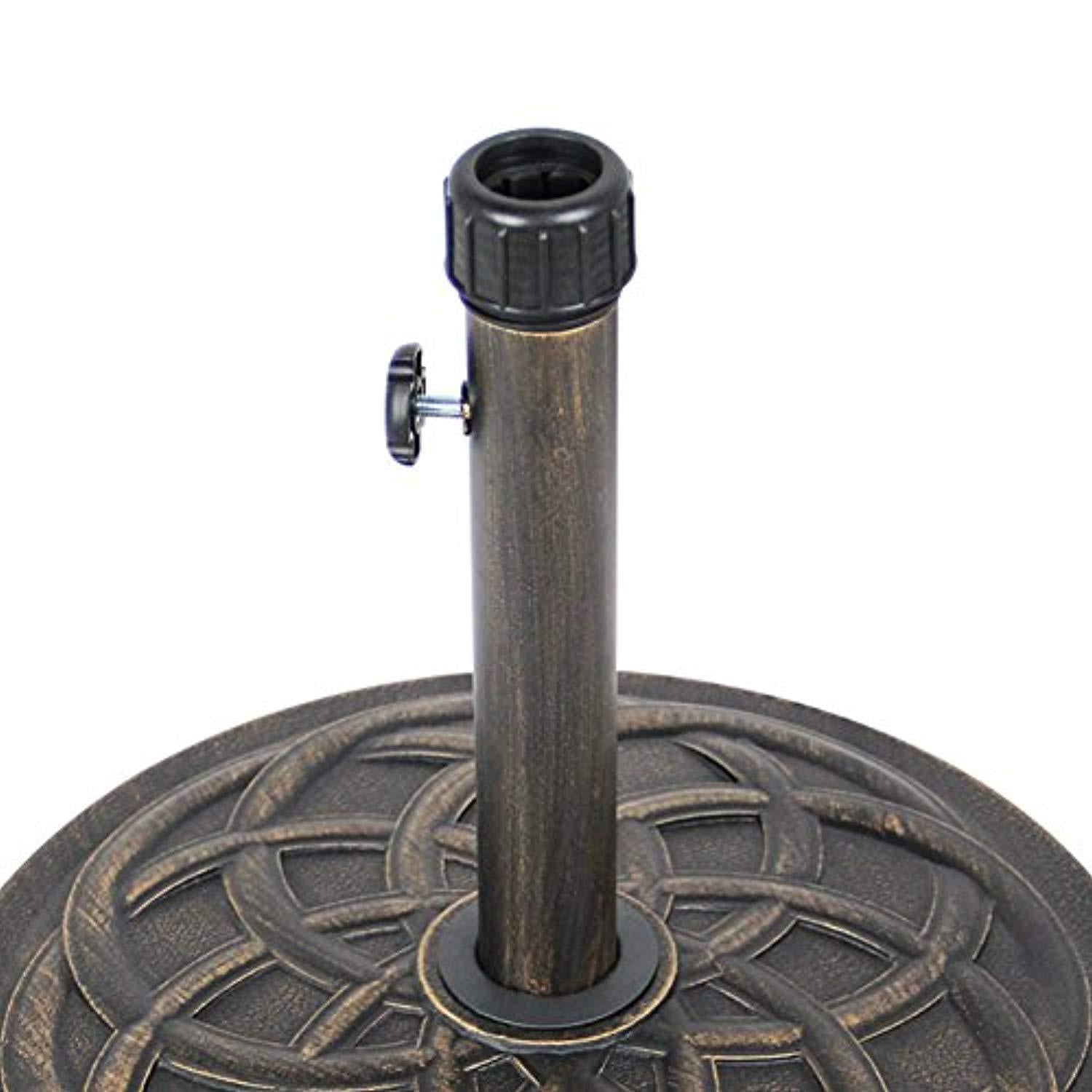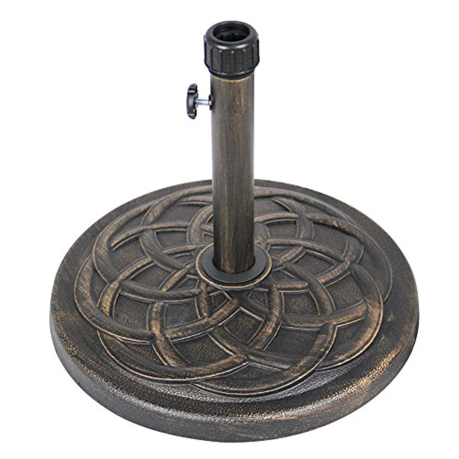 Constructed from solid concrete material, durable and weatherproof Features a ha Features a hand-turn tightening knob for securing umbrella to the basend-turn tightening knob for securing umbrella to the base Antique bronze finish with an attractive decorative pattern giving your outdoor decor a classic vibe, help you enjoy your patio umbrella