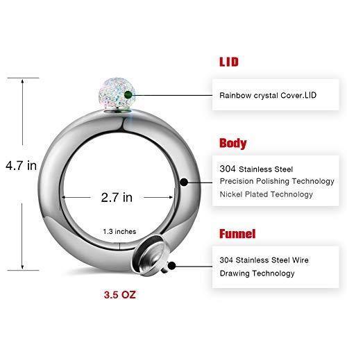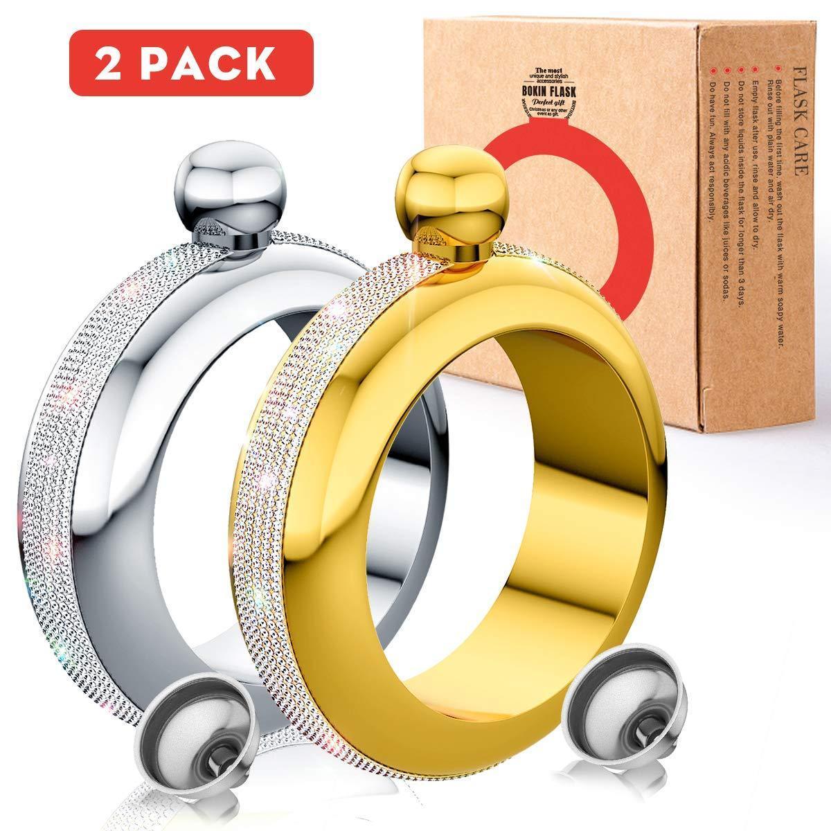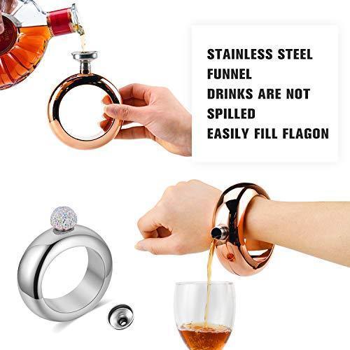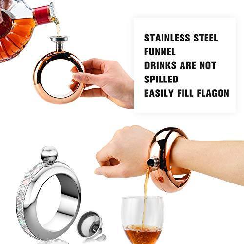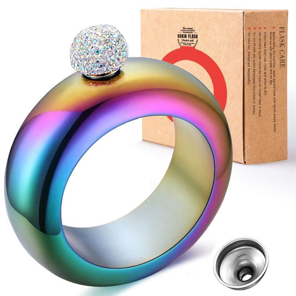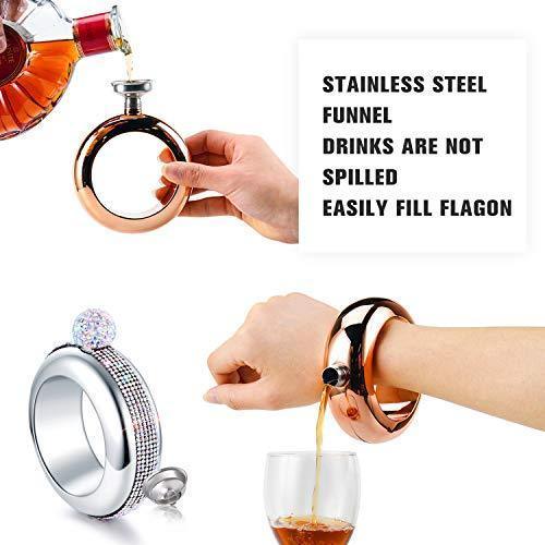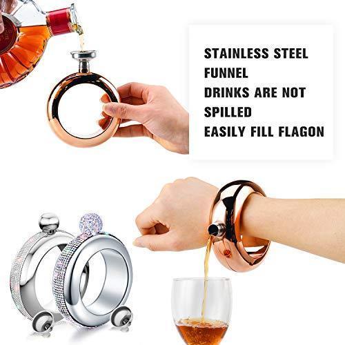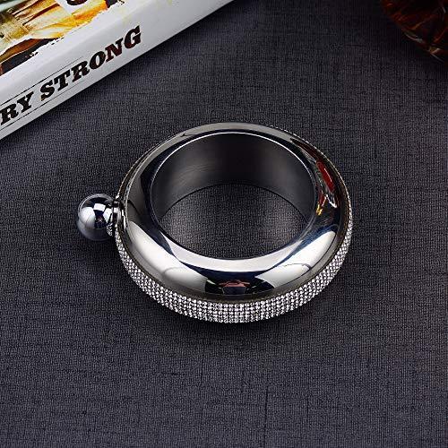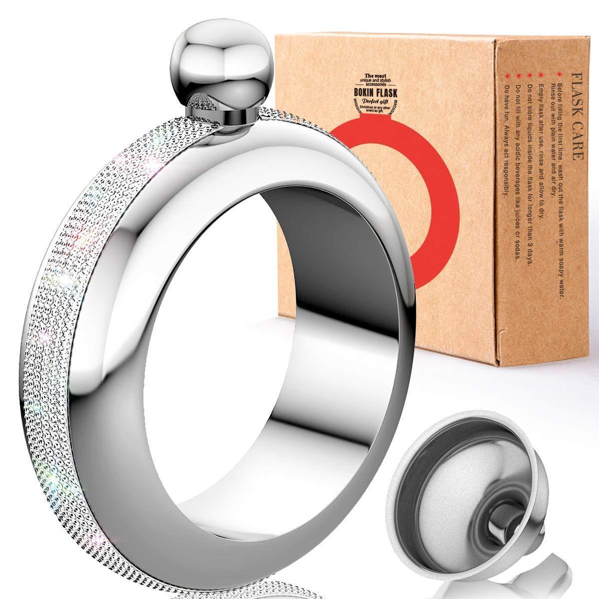 BOKIN Bracelet Bangle Flask 304 Stainless Steel Wine/Alcohol Wrist Flasket with Handmade Rhinestone Lid, Funnel in Gift Box For Women Girls Dance Birthday Party Club Bar 3.5oz Silver