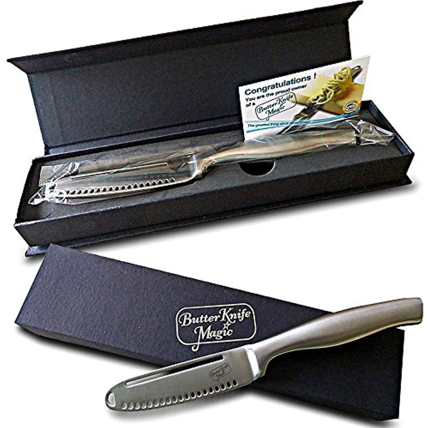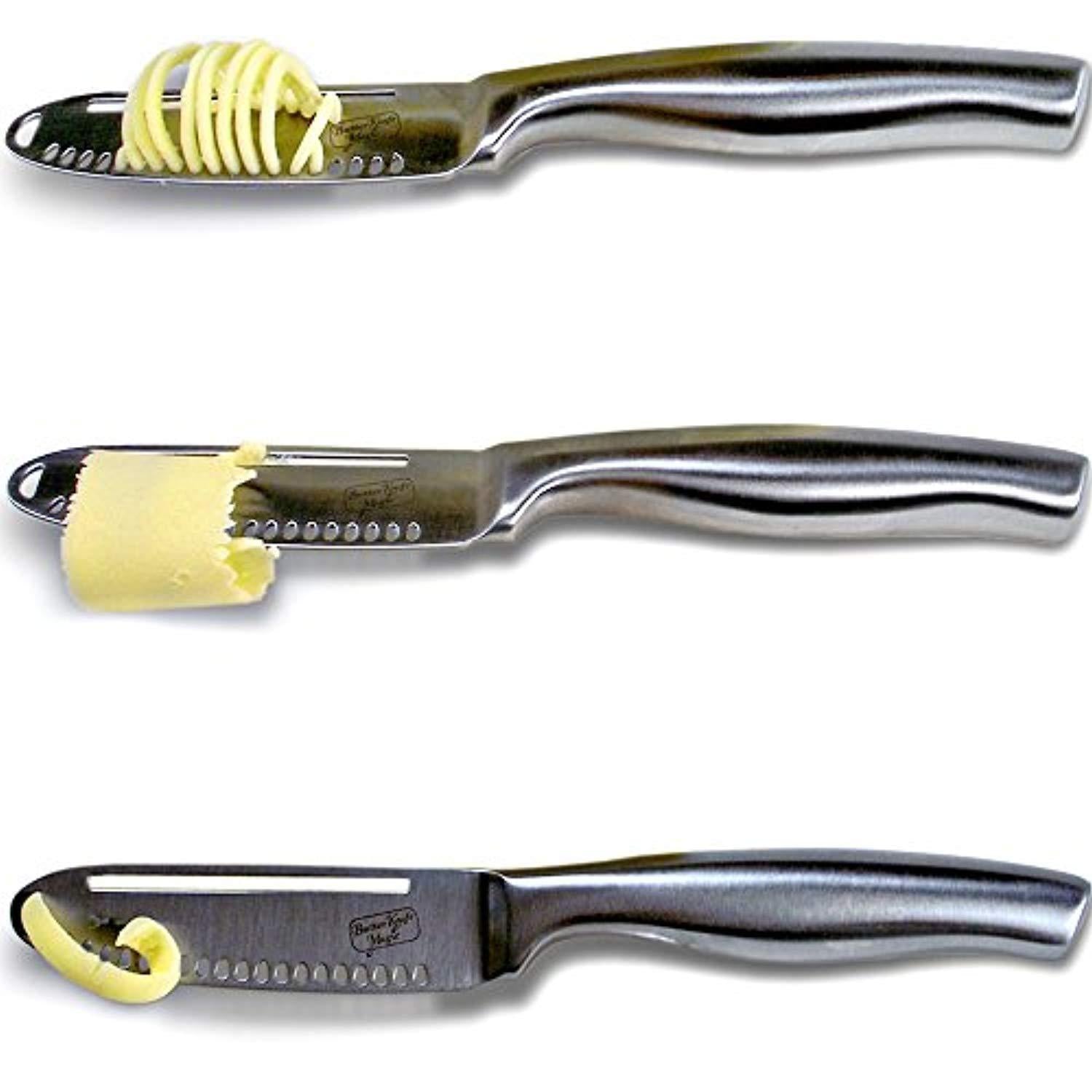 Butter Knife Magic, 3-in-1 Spreader, Grater, Slicer, Curler, 304SS Stainless Steel with Brushed Metal Finish. Create Spreadable Butter Ribbons and Slices. Stop Tearing Your Bread. Makes a Great Gift.