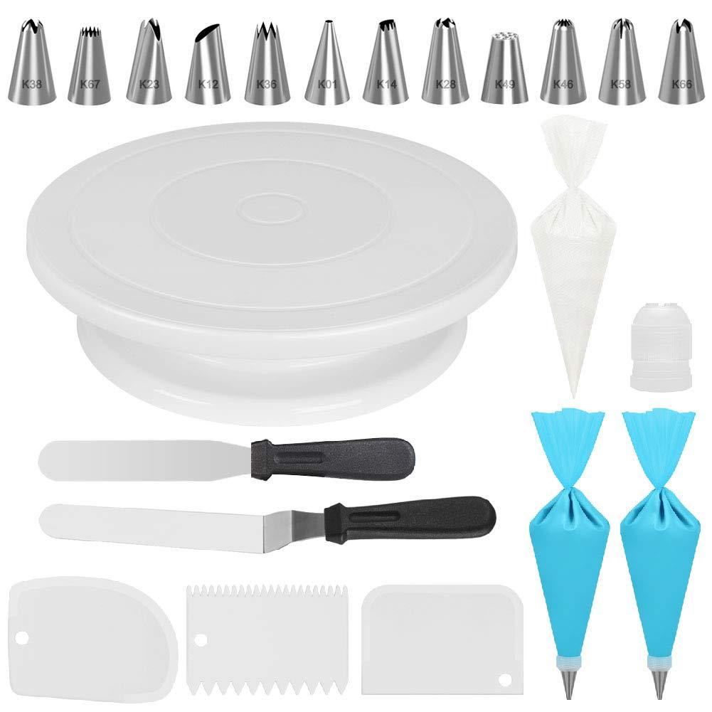 Revolving Cake Turntable: Turns smoothly in clockwise or anticlockwise direction, allows you easily create beautiful borders when decorating cakes. (NOTE: The decorating tips, bags and scraper are at the bottom of the cake turntable when you open the package)