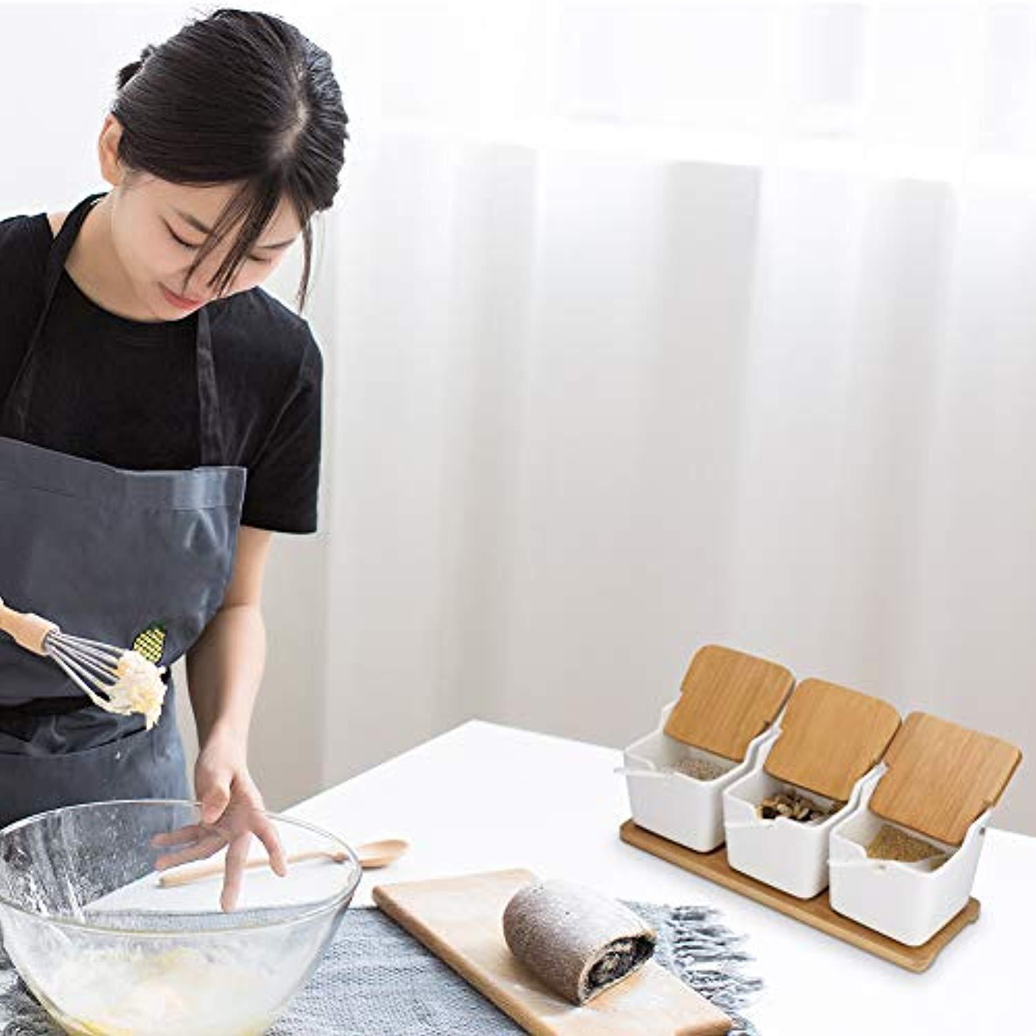 Ceramic Condiment Containers Spice Jars with spoon - Bamboo Spice Containers with Lids, Sugar Storage Container and Salt Seasoning Box for Kitchen and Home, White, 250ML (8.54OZ), Set of 3