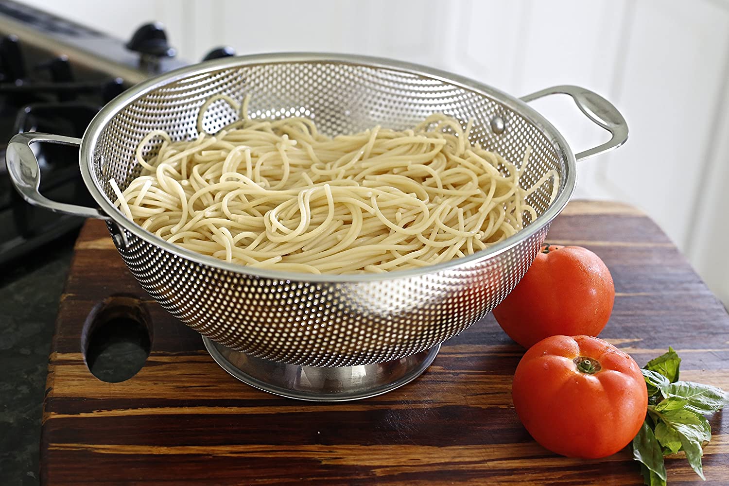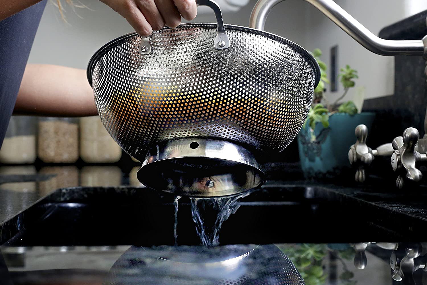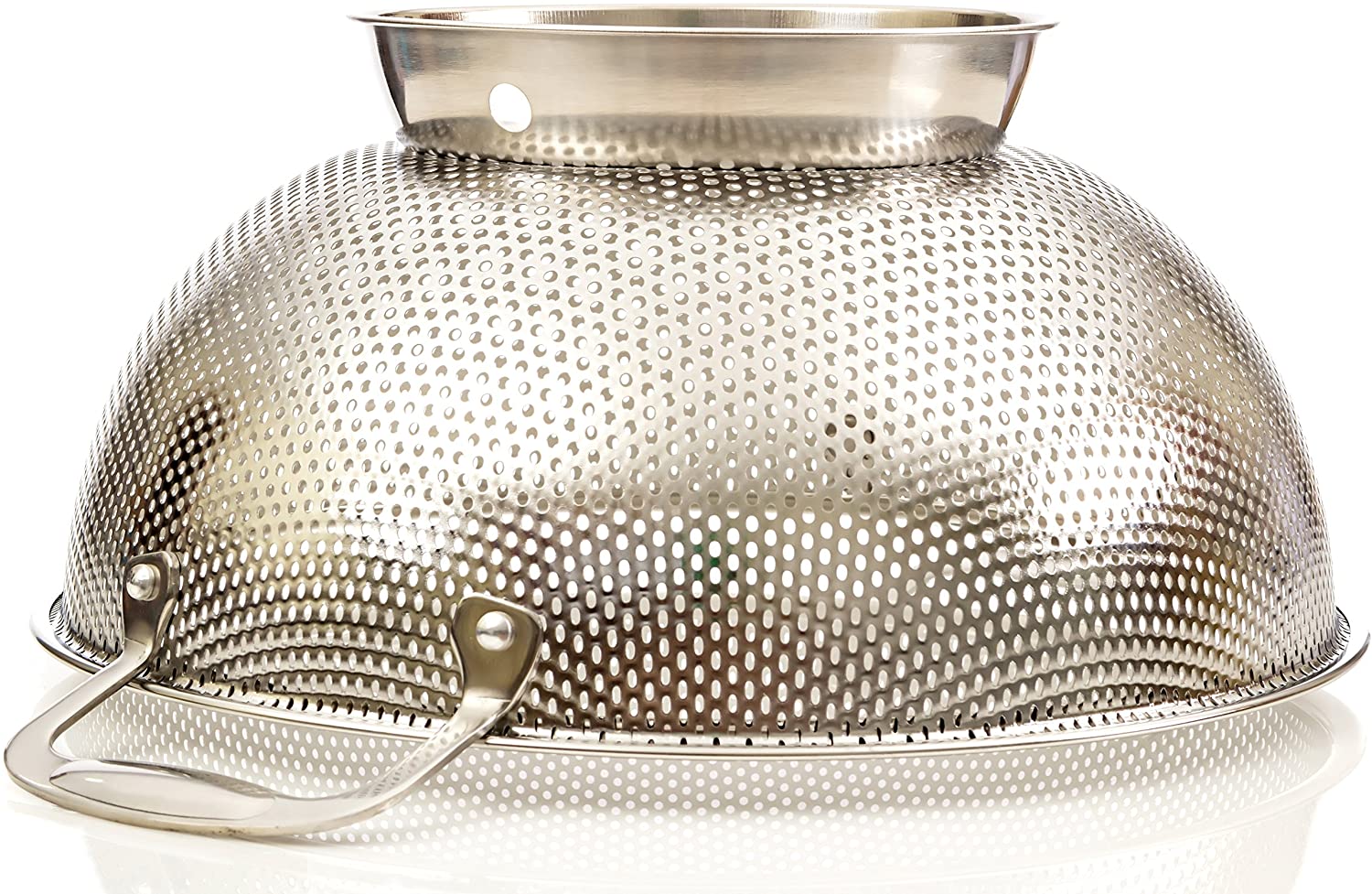 MICRO-PERFORATED HOLES DRAIN FASTER AND PREVENT FALL-THROUGH – Extra close, small holes on every surface allow for super-fast drainage so you don’t have to tilt the bowl to get all of the water out. Our robust sieve holds onto your spaghetti noodles and cooked rice and stops small foods from falling through.SAVE TIME CLEANING – 100% dishwasher safe and rust-proof, this 5 Quart colander has never been easier to clean. The smooth pierced metal is gentle on your dish cloths and hands.INDESTRUCTABLE DESIGN WITH RIVETED HANDLES – Constructed of professional grade 18/10, 304 stainless steel and built to last a lifetime. Our steel will never deform or bend as it’s 20% thicker than other colanders. Our premium handles are riveted to the bowl and will never come off!GUARANTEED FOR LIFE – Rest assured, we are so confident that you will love our product that we back it up with a 100% lifetime manufacturer’s warranty. If you are unhappy with your purchase for your reason, get your money back – no questions asked.RAPID DRAINING RING BASE THAT WON’T TIP OVER – The sturdy solid ring base keeps the colander from tipping over so that you can fill it up without fear of dumping your food. Precision-cut drainage ports are added to the base to prevent backflow, now water will not get trapped in the base.