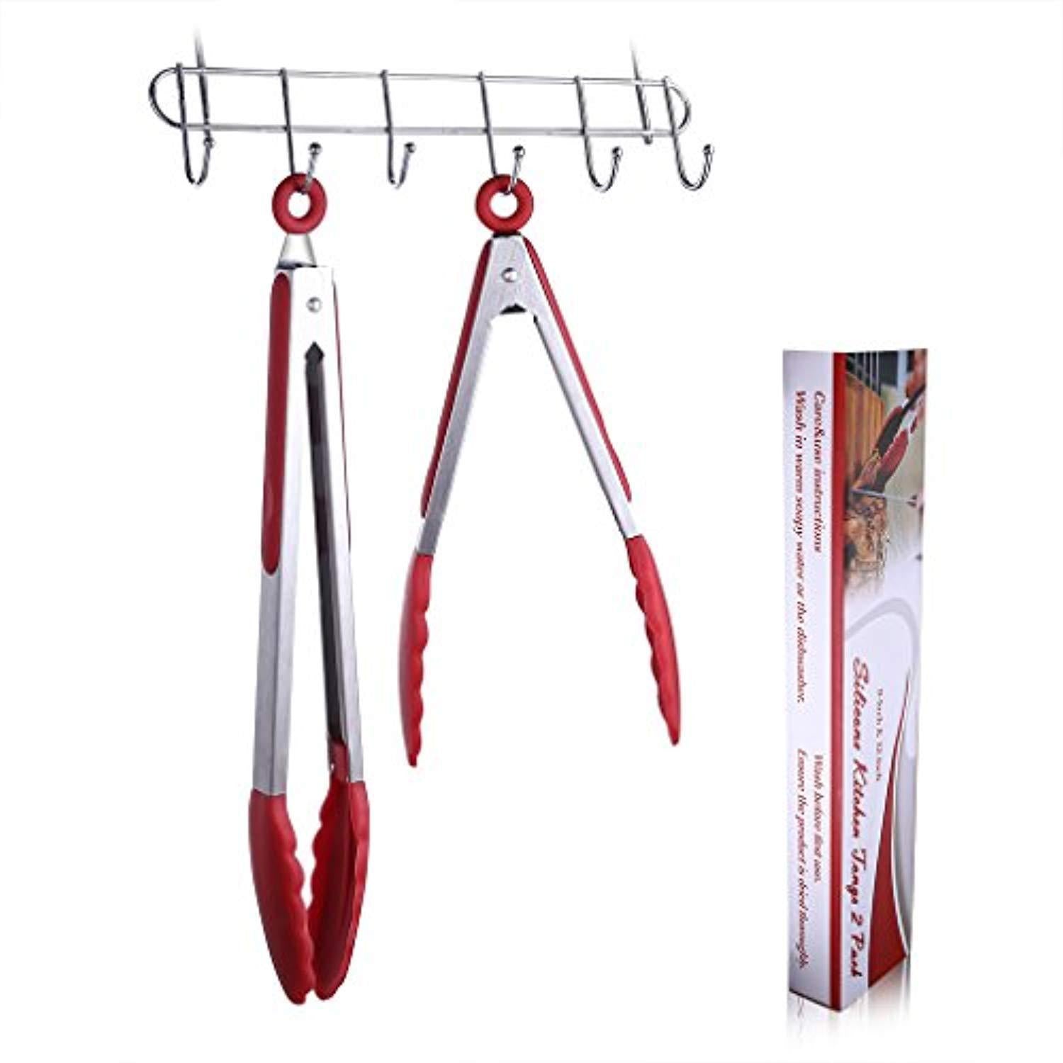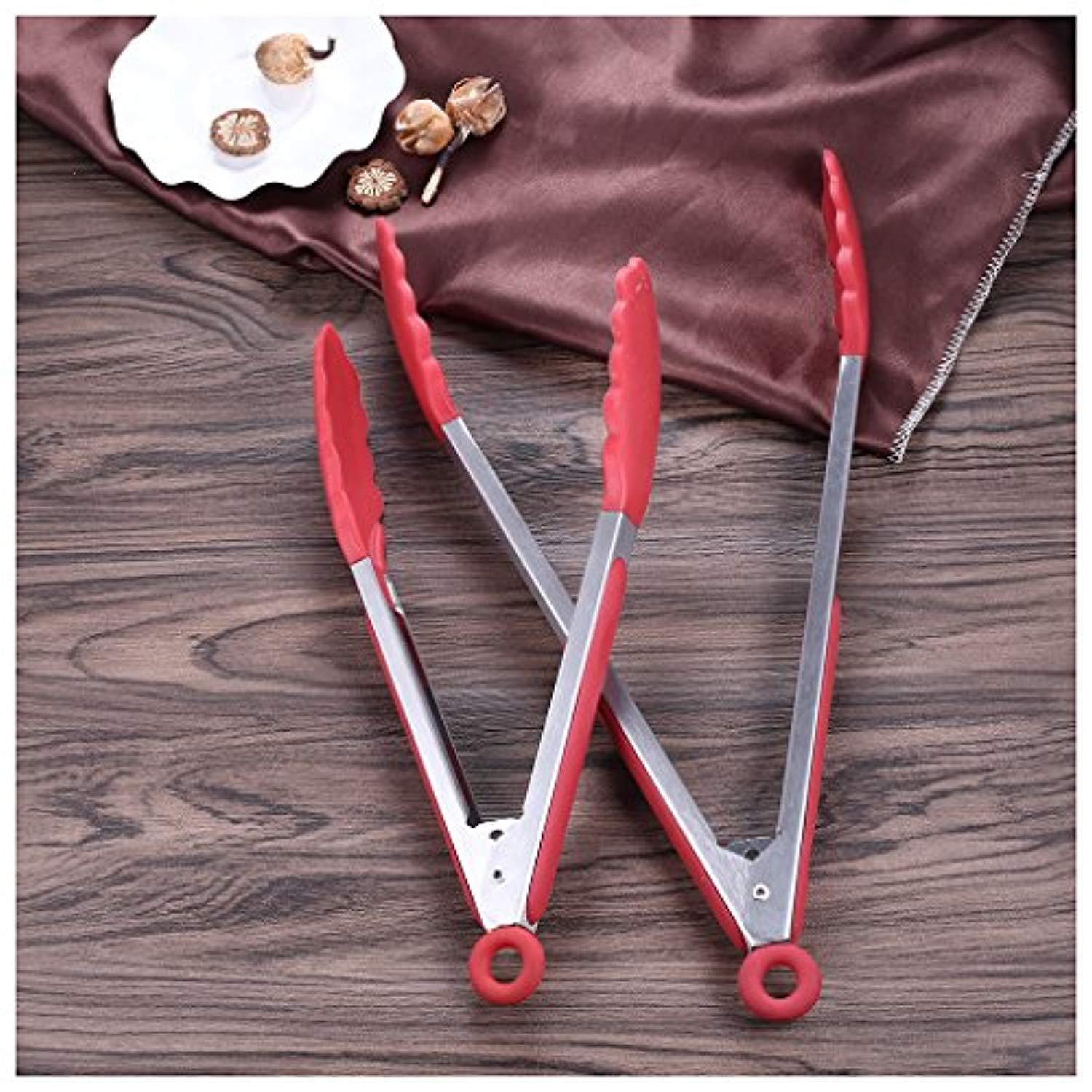 Cooking Tongs, Wik Suang Heat Resistant Kitchen Tongs, Stainless Steel With Silicone Heads, Non Stick Locking Tongs, Good Grips Barbecue Tongs (Red)