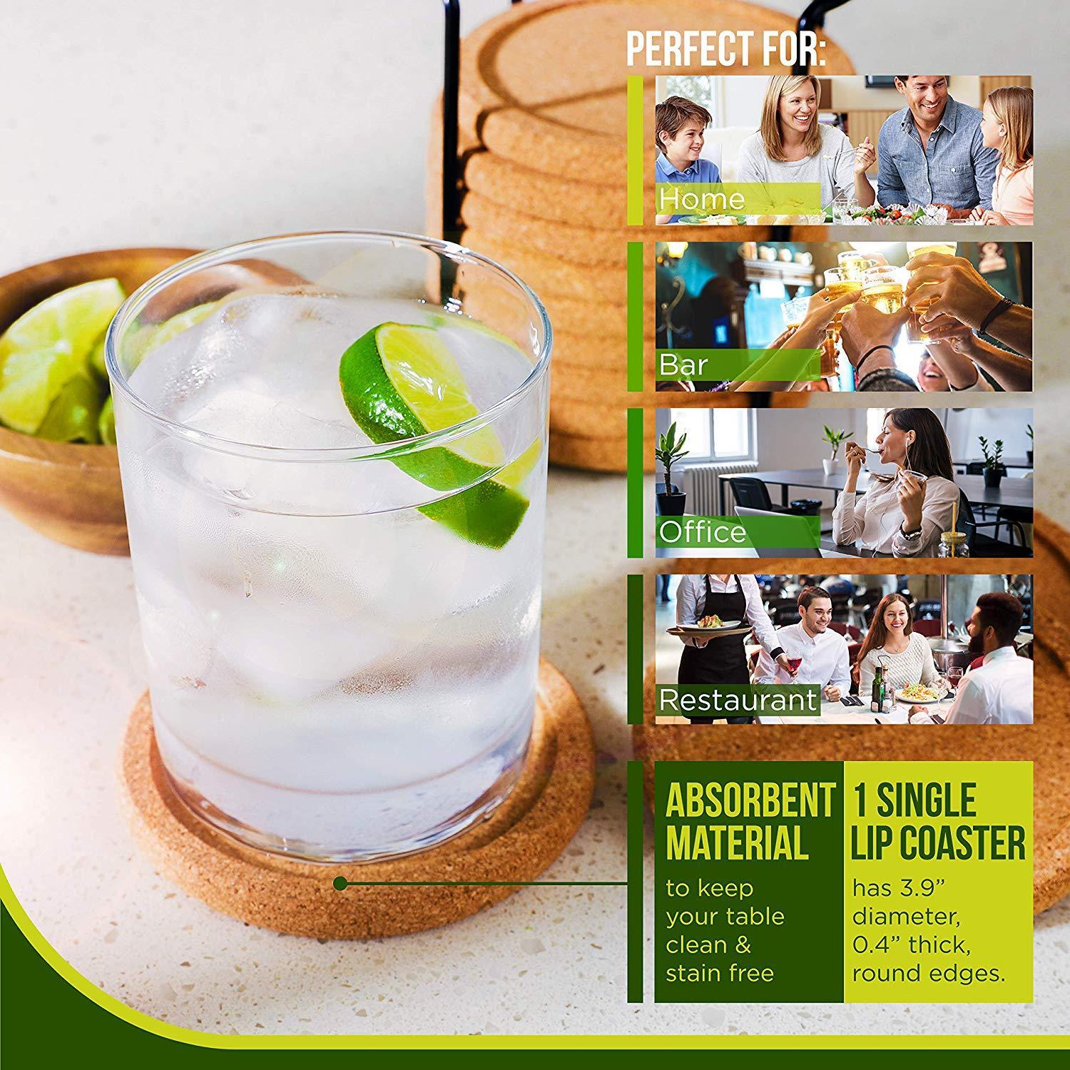 Cork Coasters with Lip for Drinks Absorbent | 12 Set 4 Inch Thick Rustic Saucer with Metal Holder Heat & Water Resistant | Best Reusable Natural Round Coasters for Bar Glass Cup Table by Decopom