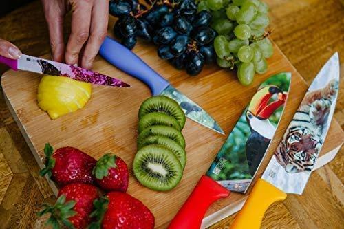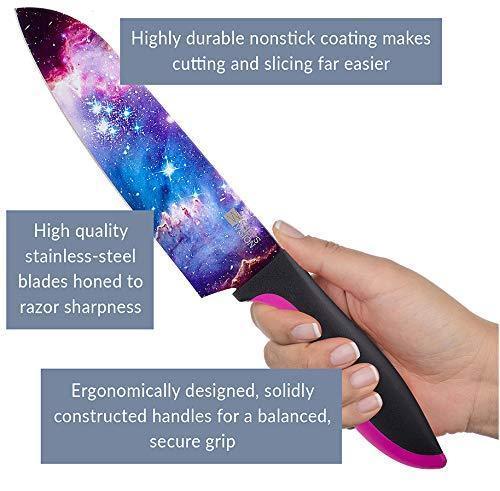 WHAT AN OUT OF THIS WORLD GIFT! What’s the best thing Chef’s Vision Cosmos Series Knives make? That’s easy: they make the perfect gift! Whether it’s for the Holidays, Mother’s Day, for newlyweds, a great Father’s Day gift, a graduation or birthday gift…and maybe best of all, a gift for yourself and your whole family, one you’ll enjoy every time you use it! And each set arrives in a beautiful gift box that includes an informative free guide to each of the gorgeous cosmic images on the blades! WHAT A BEAUTIFULLY CRAFTED SET OF KNIVES! The blades are high quality, durable stainless steel honed to razor sharpness for cutting ease. The solidly constructed handles are ergonomically designed for a balanced, secure grip, and they’re color-coded so busy chefs can easily find the right knife, to help prevent food cross-contamination. Plus, they’re dishwasher safe and are food safety approved by the FDA in America, LFGB in Germany, SGS in Switzerland, EC in Europe and DGCCRF in France. WHAT A GREAT NON-STICK COATING! Another beautiful attribute of the beautiful pictures on each blade is that they also serve as a highly durable nonstick coating, which makes cutting, slicing and paring far easier, so even the thinnest cucumber slice just slides right off the blade! Imagine how much faster, easier and enjoyable Chef’s Vision knives will make all your food preparation. So the sheer pleasure of cooking will be enhanced — another beautiful advantage of using Chef’s Vision Knives.