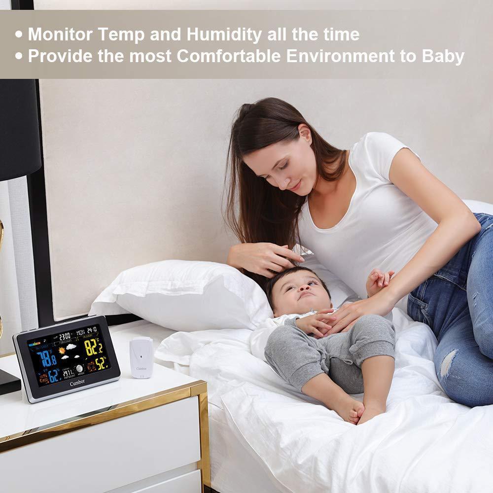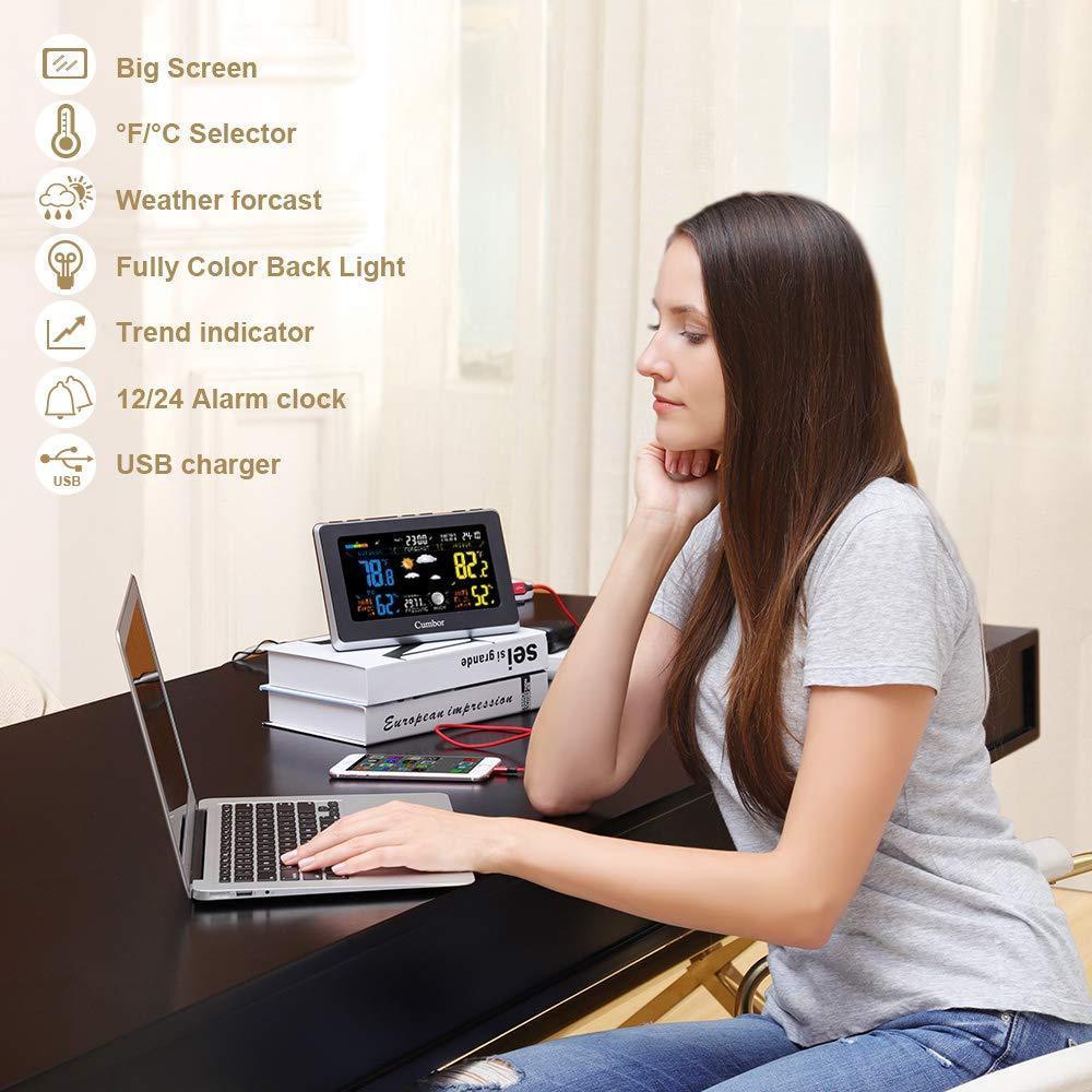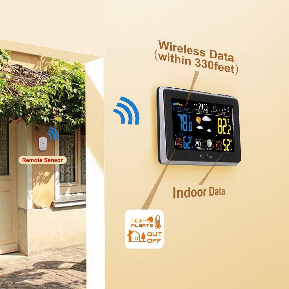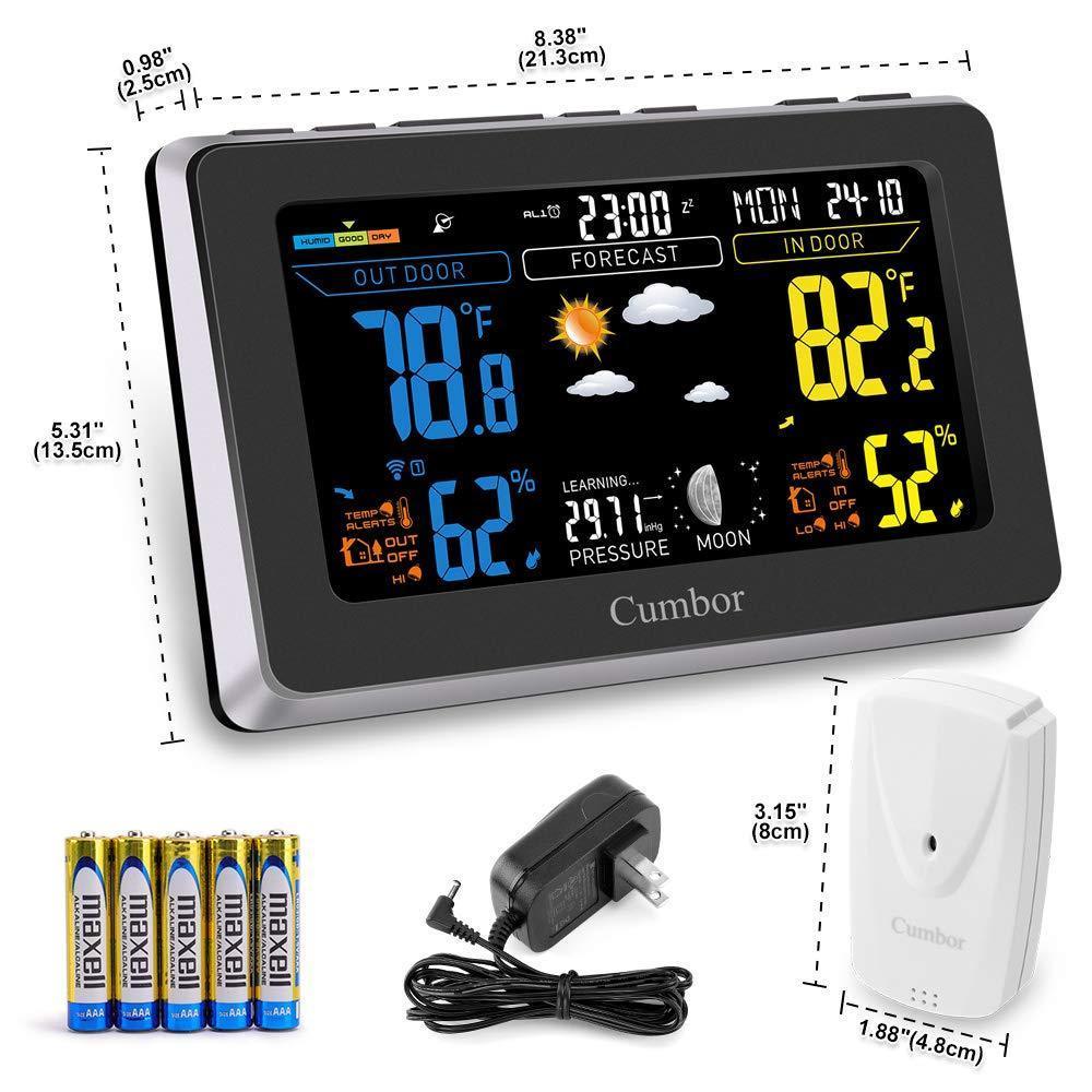 Tips : Cumbor Authentic weather station is out of stock now and the sales price is only $49.99, but the copies are not worhty $100, this is ridiculous!!! 【Large screen】 - Full Color 7.5 inch Screen and big digits help the old and the short-sight to identify the data more clear than LED display, even from any angle or distance . A perfect gift for parent or grandparent. 【Smart Sensor】 - Only need to install the batteries into the sensor and the sensor will connect to the main automatically(If you didn't find the data on the weather station,click the "CHANNEL" BUTTON for 3 time and you will solve this problem 【Accurate data】 - Weather station shows indoor/outdoor temp (°F/°C) and humidity with daily highs/lows alarm alerts, moon phases, pressure with trend indicator, clock, and calendar. Accurately forecasts the weather through comprehensive data.