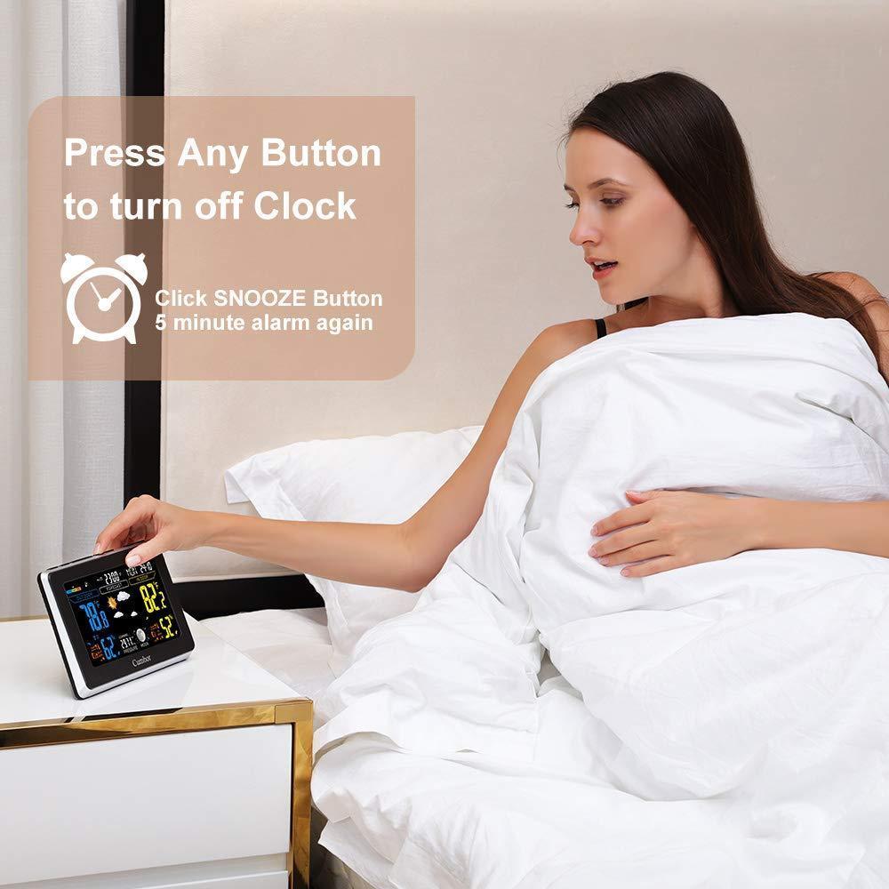 【Weather forecast】 - Full Color Screen with accurate 12-24hr future weather and Air pressure forecast: sunny, partly sunny, cloudy, rainy, Stormy and snowy So you can plan your time Easily and protect yourself from cold, arthritis, tracheitis, and myocardial infaration etc. 【Auto-time setting】 - WWVB atomic self-setting time . Automatically updates daylight saving time, which solve the worry about power failure and need to reset the time(If met the Time zone intersection problem,Long press the "MODE"BUTTON,choose time between PST MST CST EST the problem will solve) 【Wireless range】 - Wireless all-weather outdoor sensor features wireless range of up to 330 feet (100 meters). placing the sensor in the baby room can provide a comfortable temp for the baby 24H or Place it outside. Even if you aren't staying at home, you can know the weather condition in advance and prepare in advance for what to wear when going outside.