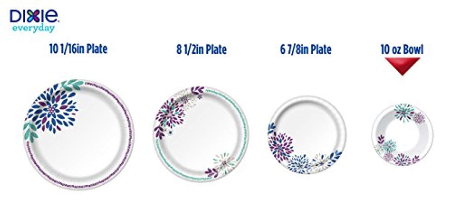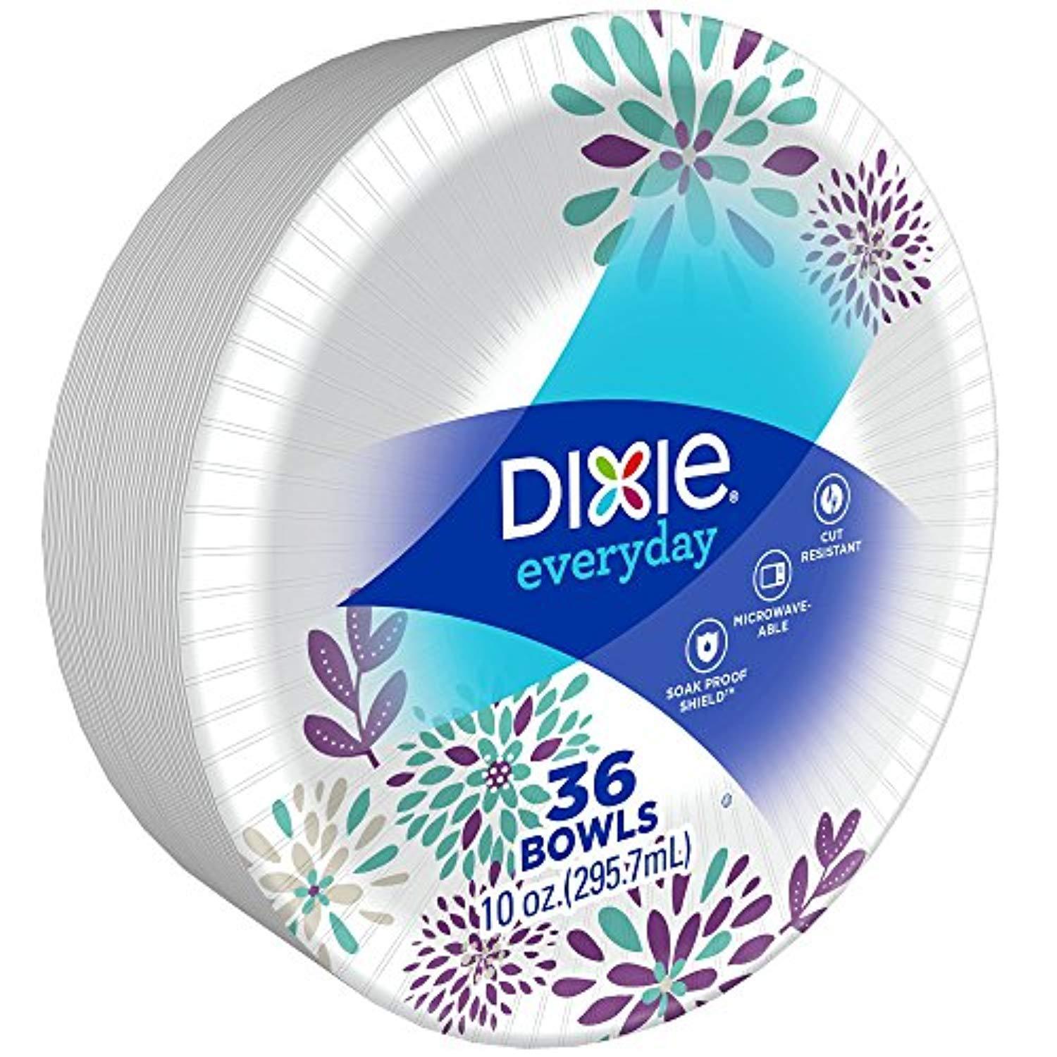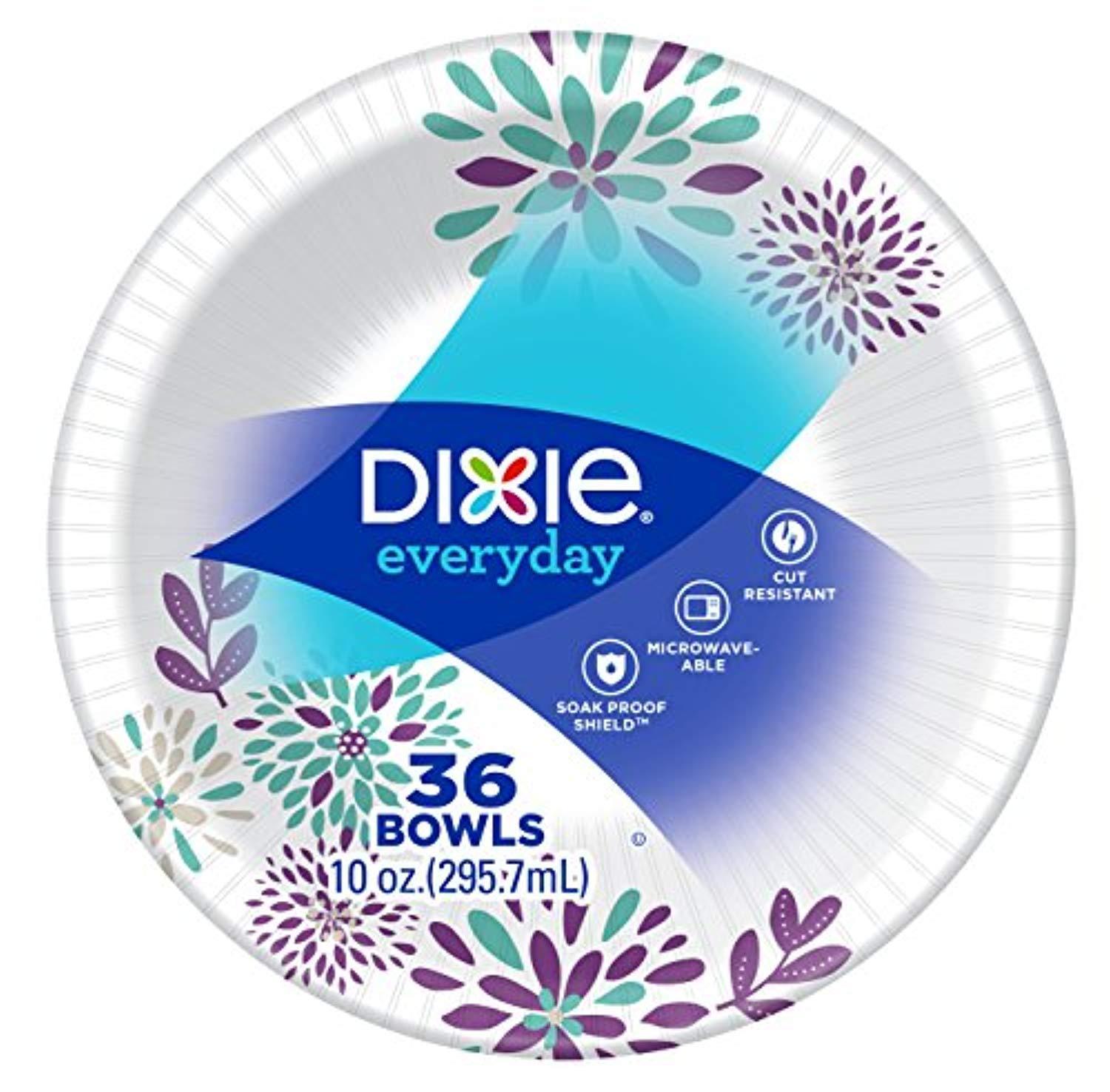 36 disposable bowls (10 ounce capacity); designs may vary. Paper bowls are perfect for everyday meals, birthdays, and holidays at home. Modern floral design features bold color plate with a perfect balance of white paper plate. Microwavable, cut resistant, and coated with a Soak Proof Shield that can handle anything hot and cold, from soups to ice cream. Perfect for chili, rice bowls, frozen desserts and hot meals. Perfect pairing with paper cups, napkins and paper plates for year-long use in your barbecues, dinners, lunch, and other meal occasions. Gluten free, BPA free, and Kosher certified. Recyclable (facility must accept food-contaminated paper waste) and compostable in composting facilities (not at home). Subscribe and Save up to 15%; try our Dixie Ultra Plate for your special occasions such as Christmas, Easter, Thanksgiving, Hanukkah, and other holidays, and use our Dixie To Go paper disposable coffee cups to fit in most coffee makers and car cups. Dixie paper plates are also available in a dinner large plate size, a medium lunch or snack size, and as a small or medium bowl. Our patented coated paper products are strong, moisture resistant, and heat resistant, which is why Dixie paper plates are a great alternative to melamine plates, foam plates, and other disposable paper plates.