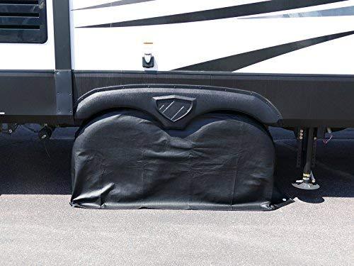 EASY TO INSTALL & REMOVE: 1 dual axle RV wheel cover simply slips over 2 tires that are attached to your RV (1 cover included); Simply fit over your tires with bag opening facing the tire (so outside of tire is fully covered); The included bungee strap secures the cover to protect against elements, dust, spills