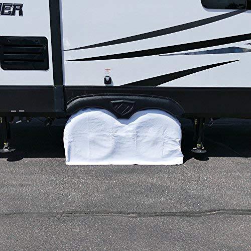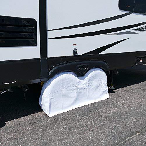 FOR MEDIUM DUAL AXLE TIRES: Fits dual axle RV, camper, motorhome, and trailer tires with a diameter between 27 inches and 29 inches (69cm to 74cm); Measure your tires (not the rims/wheels) from outside edge-to-edge with the measuring tape running through the center axle point (can also measure from the top of the tire tread to the ground to ensure that the size you select will completely cover the tire)