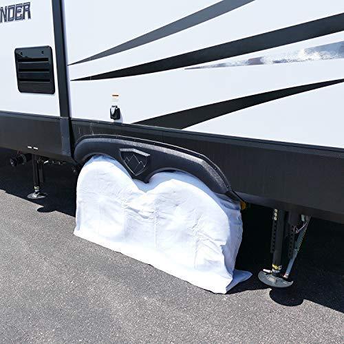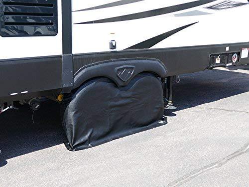 PROTECT YOUR TIRES: The Dumble Medium Dual Axle RV Wheel Covers 1-Pack is water resistant and weatherproof to offer year-round protection against the sun, rain, snow, wind, dust, and dirt; Allows less air to intrude, meaning less chance of dry rot; Prevent premature cracking of sidewalls that can lead to on-road blowouts; It can be used outdoors in your yard or indoors inside your shed to prolong tire life while your vehicle is parked