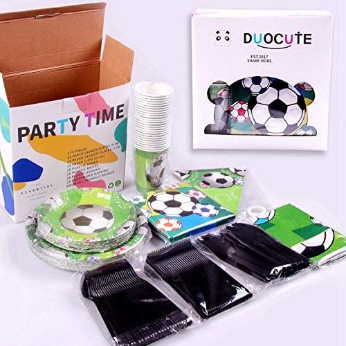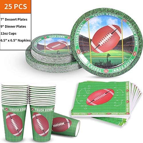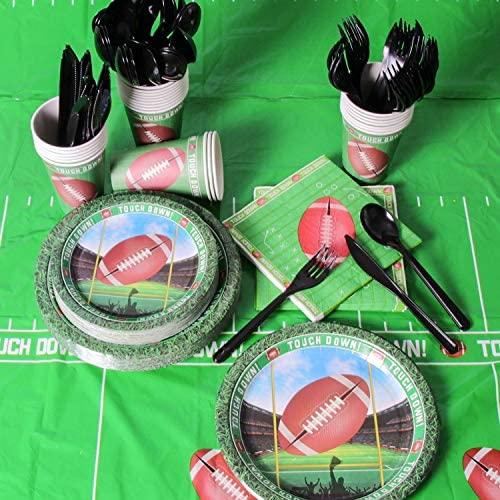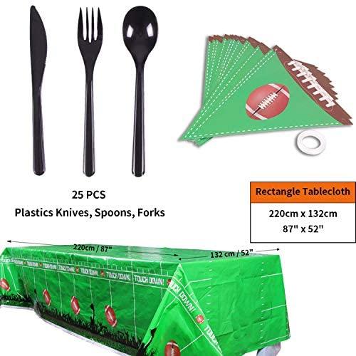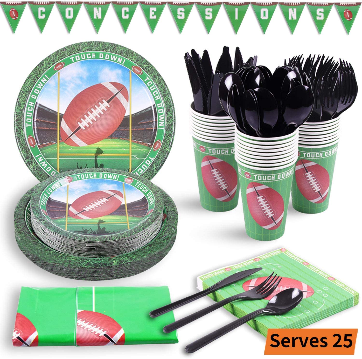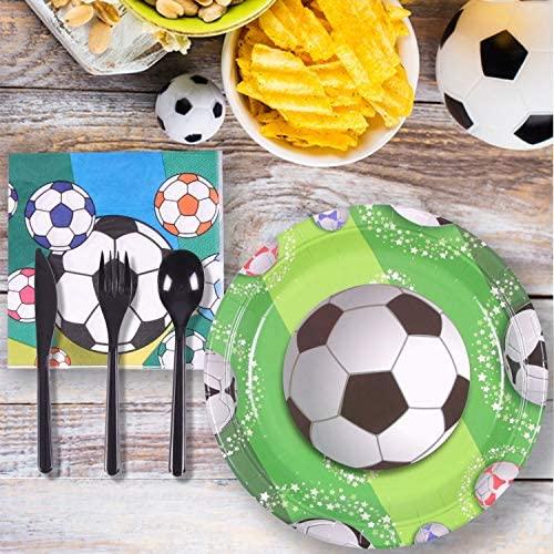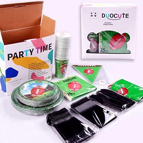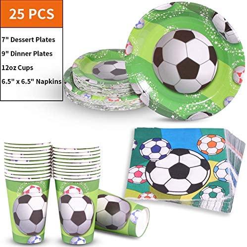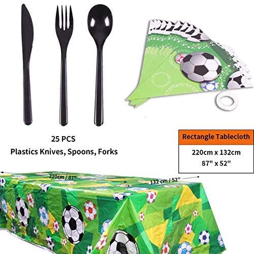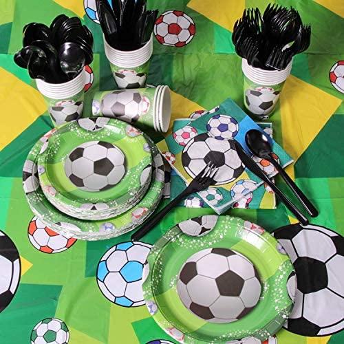 KIT FOR 25 GUESTS: This 177pcs soccer party paper dinnerware set includes 25 9" dinner paper plates, 25 7" paper dessert plates, 25 12oz paper cups and 25 luncheon napkins 6.5" x 6.5", 25 sets of black plastic cutlery (25 forks, 25 spoons, 25 knives), 1 tablecloth and 1 triangle banner.