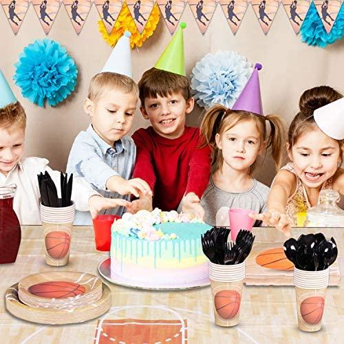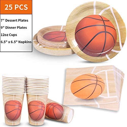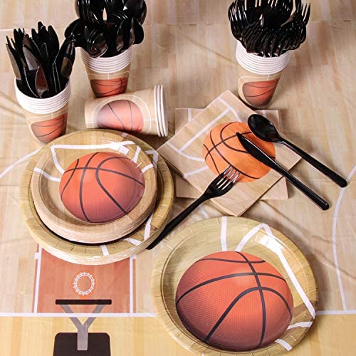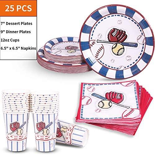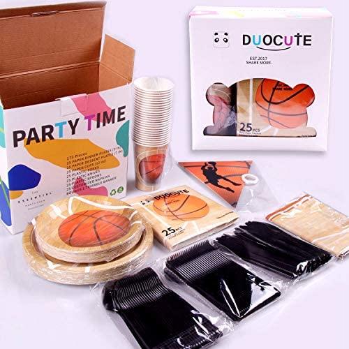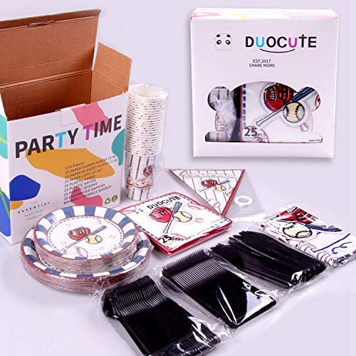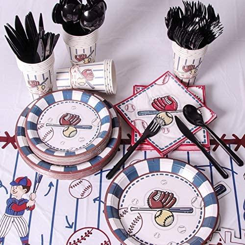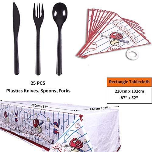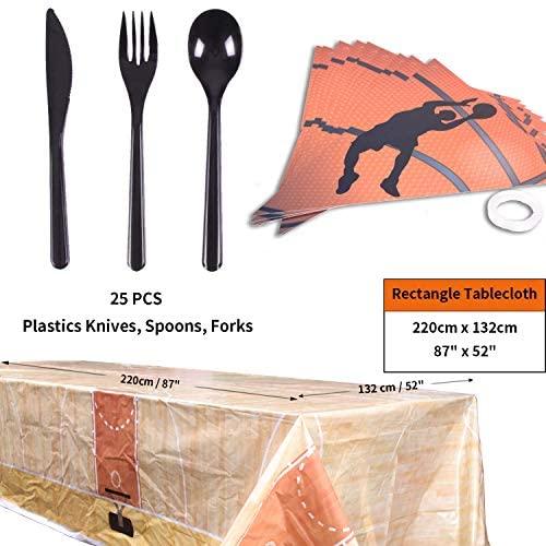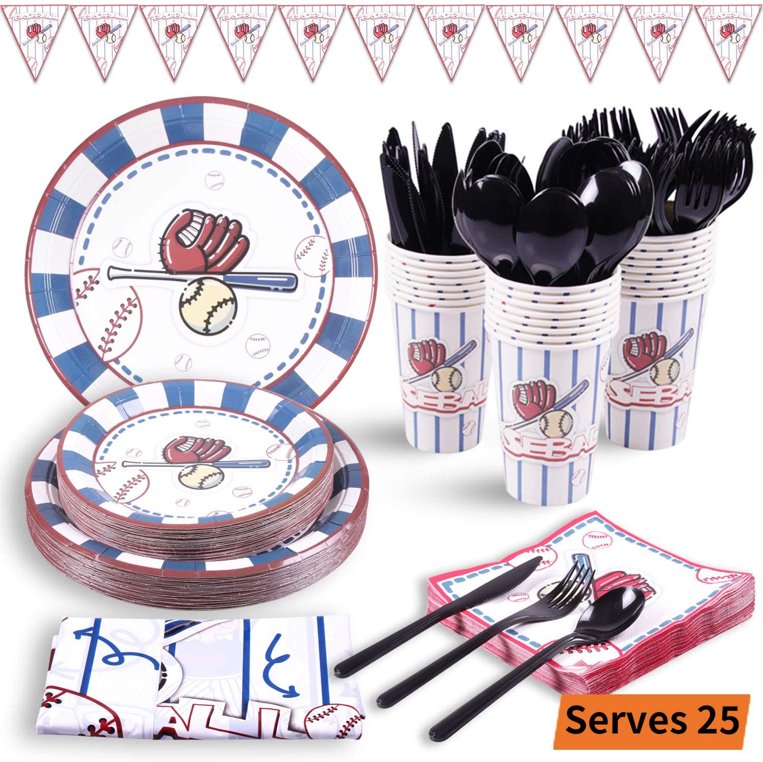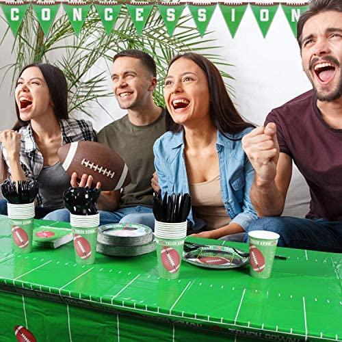 KIT FOR 25 GUESTS: This 177pcs soccer party paper dinnerware set includes 25 9" dinner paper plates, 25 7" paper dessert plates, 25 12oz paper cups and 25 luncheon napkins 6.5" x 6.5", 25 sets of black plastic cutlery (25 forks, 25 spoons, 25 knives), 1 tablecloth and 1 triangle banner.