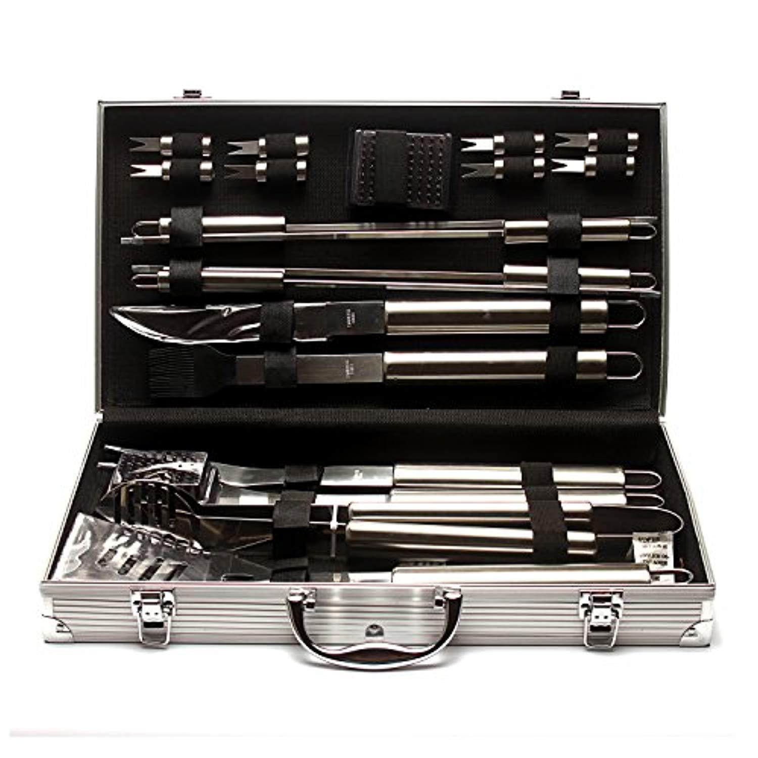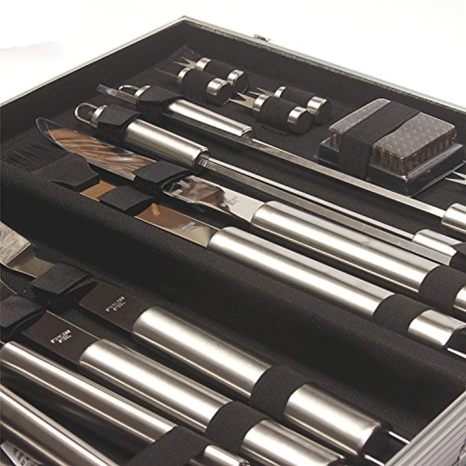 High grade 18/8 stainless steel grilling tools - will not rust/crack, easy to clean. Elongated hollow handles keep your hands safe from the heat, while being light to hold. Handle loops to hang on grill hooks, handy and convenient. All bbq grill tools are secured with elastics and velcro tapes, will not fall out of place. Neat and organized. Sturdy aluminum case with dual latches, easy to storage and carry.