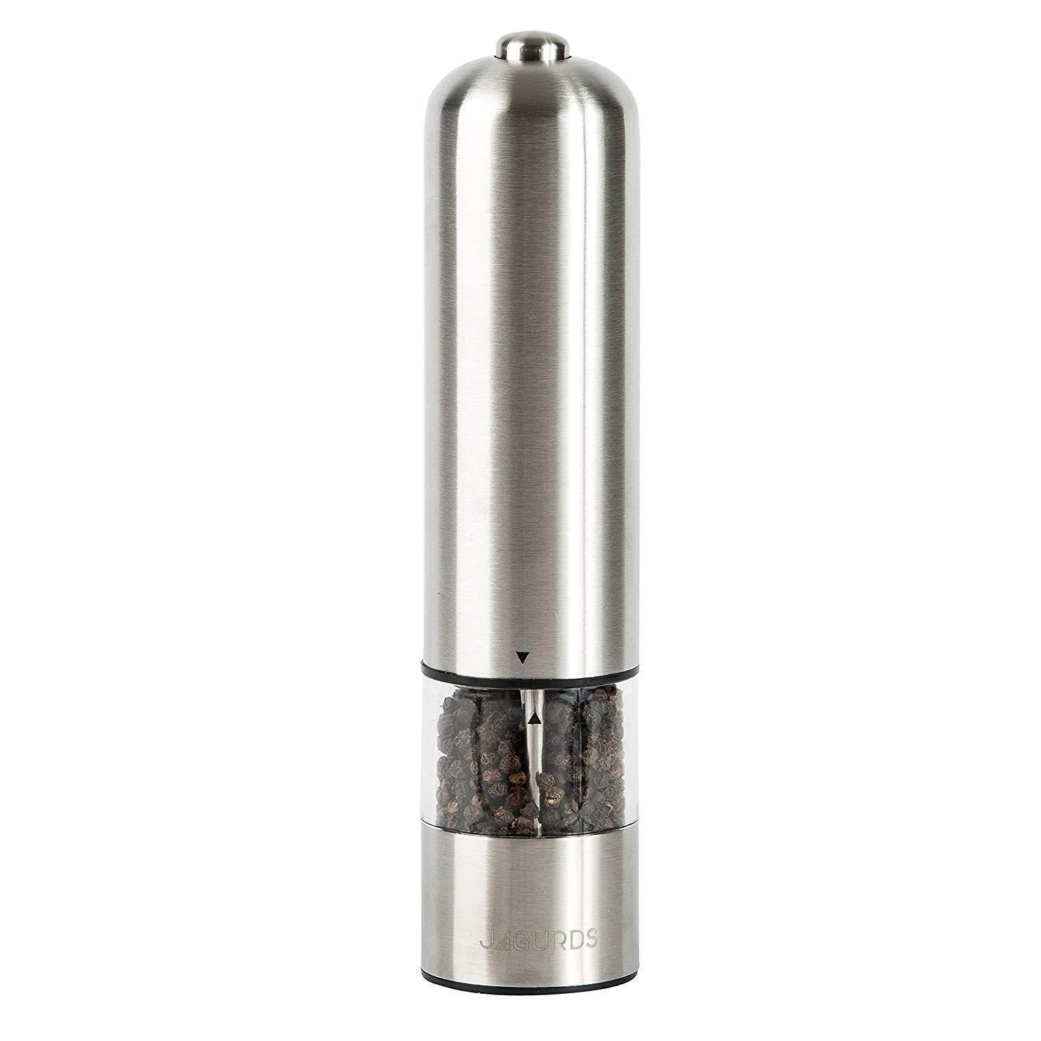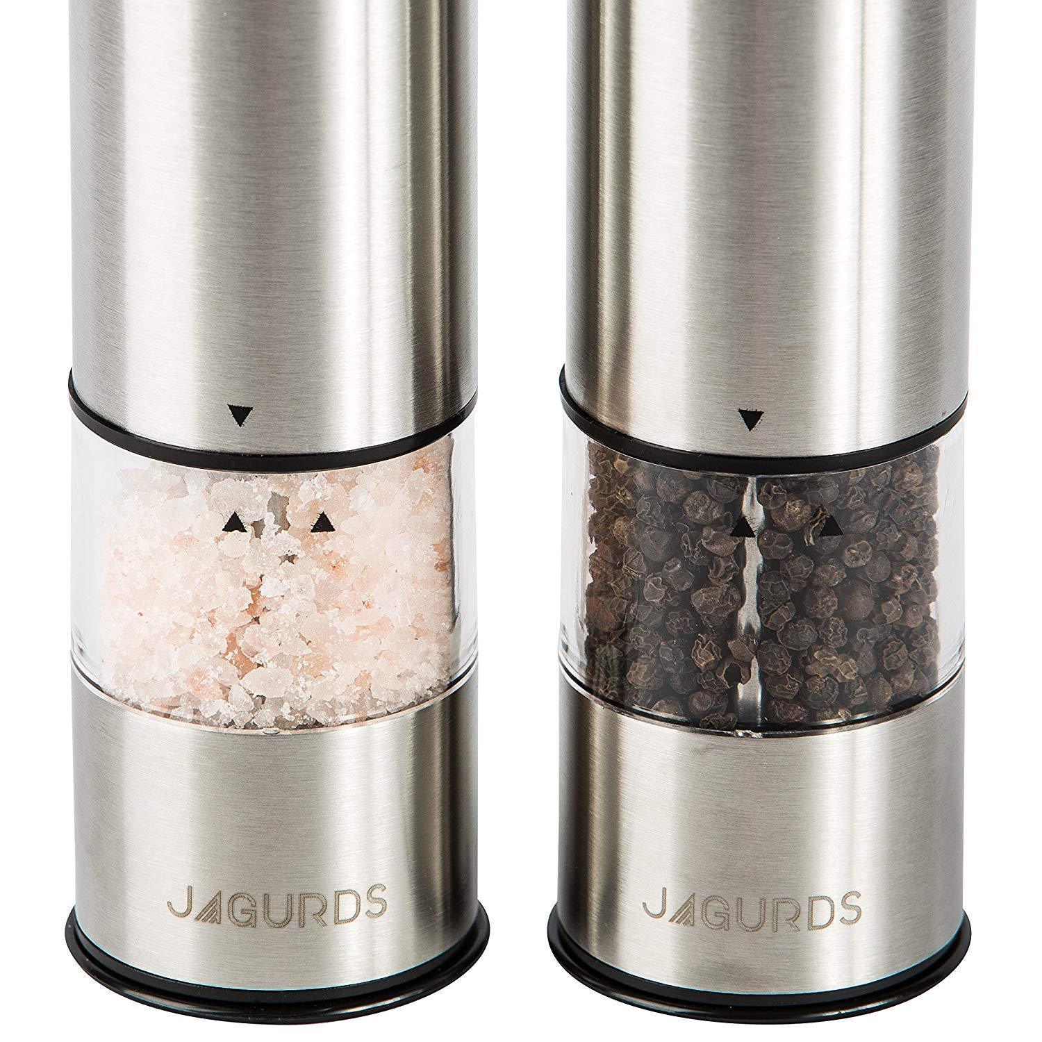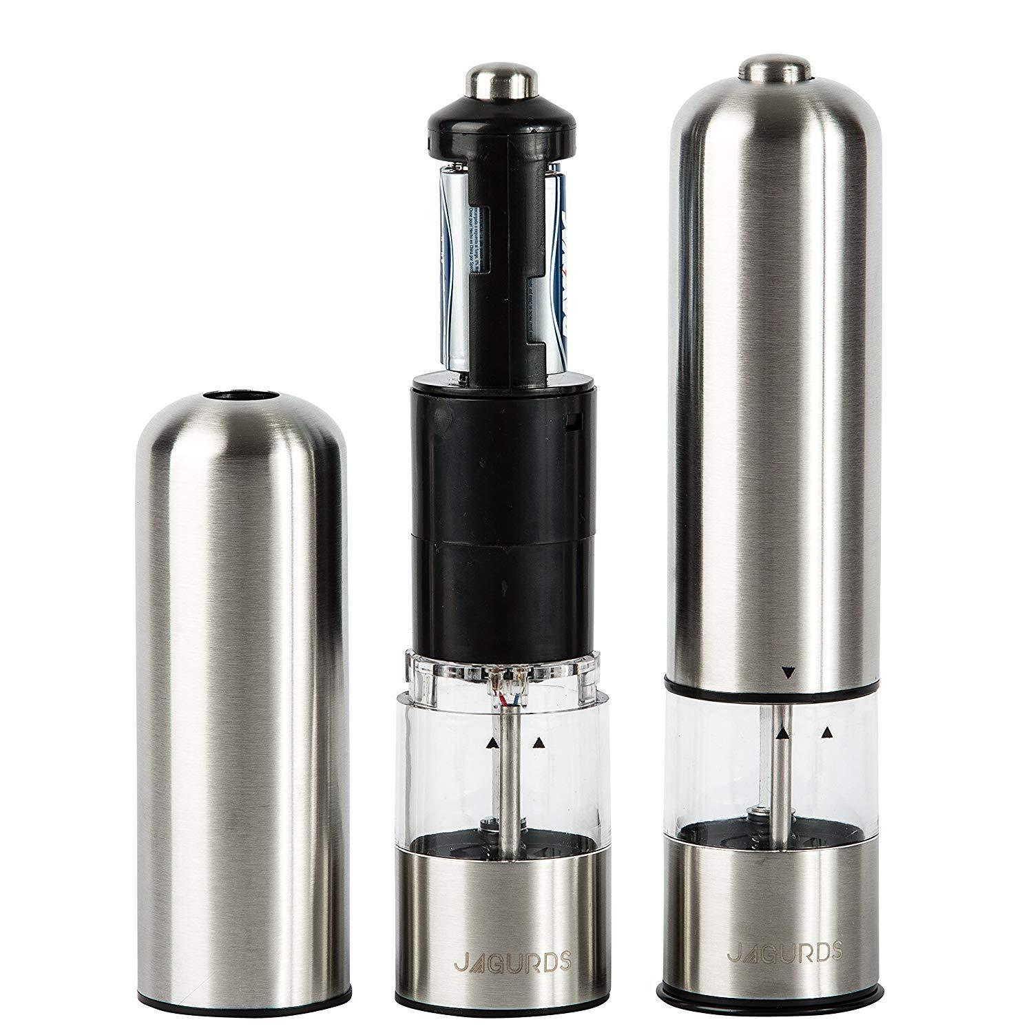 PROFESSIONAL QUALITY THAT LASTS. Its Brushed Stainless Steel body & Acrylic chamber design make the grinders extremely durable with no risk of glass breakages. Its strong and fast motor offers long term durability that will not rust or corrode ensuring safety of your food. Guaranteed to hold up against the toughest peppercorns, Kosher salt, Himalayan salt or other spices without clogging or jamming. These are definitely not your average spice shakers! CONVENIENT ONE BUTTON SINGLE-HANDED OPERATION. Perfect for your loved ones who have arthritis or chronic hand pain. Use it while your one hand is busy stirring stew, marinating steak, tossing salad or even while answering your phone. Use the freshest spices in your recipes in the perfect sizes you want them to be! MODERN DESIGN. Spice up your kitchen with these sleek and stylish salt and pepper mills. Its contemporary design will be the highlight of your dining table that will surely attract compliments from your family & guests! It is constructed with 80 ml capacity see through container for EASY REFILLING and monitoring of spice levels. The bottom firmly closes to prevent leakages while maintaining the freshness of your spices. CORDLESS VERSATILE BATTERY POWERED. Each grinder uses 4 AA-sized batteries (NOT INCLUDED) which are easy to install with its easy to open cover and will power the mill's BRIGHT LED light and ceramic grinder mechanism perfectly. These portable automatic spice grinders allow you to easily move around the kitchen by keeping them at your arm’s reach . Bring them for camping, picnic or even for barbecue nights. Add that pop of extra flavor to any meal today! IDEAL GIFT. Your perfect gift for Housewarming parties, Weddings, Holidays, Birthdays. Our commendable electric salt and pepper shaker goes through meticulous inspection and quality testing to ensure our customers are completely satisfied. In the unlikely event that your grinder is damaged during shipping, defective or not to your standards, we'll be more than happy to refund you 100% within 30 days of purchase. No question asked.