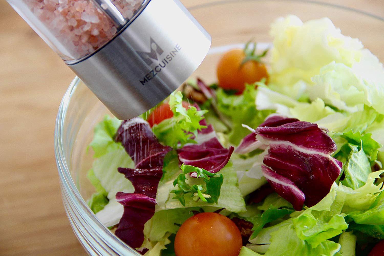 EFFORTLESS BY PRESSING ONE BUTTON to grind any spice evenly saving you time | Its way faster when compared with old pepper grinders or shakers giving you all the flavour of minced spices | You will season your food like a pro when cooking with Mezcuisine Salt and Pepper Grinder Set feeling the fantastic ergonomic shape specially designed to make you a natural chef | Master the art of seasoning by controlling the multiple coarse sizes available to you BONUS EBOOK “25 Delicious Homemade Spice Blend Recipes” that will increase instantly your cooking skills | Prepare to be praised by the amazing dishes you will prepare | Store it effortlessly thanks to the metal stand that comes as also a bonus NEW AND IMPROVED Ceramic blades made to last | Quality assured by having top tier blades and engine that grinds any spices without rusting | Built with a durable and Strong Stainless Steel Body to resist any damage | Easy to prevent lack of spices with a clear and safe BPA free plastic window to help you control the amounts | Don’t worry about any residues our pepper mill has a rubber cap made to fit the bottom of the mills that will keep your tables clean PREMIUM AND MODERN LOOK making a perfect gift to yourself or loved ones | Prepare to be complemented by the stunningly design and package, our automatic shakers were created to fit in all types of kitchens matching with style | You will see exactly the amounts of spice that are being added to the food with the incorporated LED light to prevent over flavouring, particularly useful with difficult to see spices like regular Salt