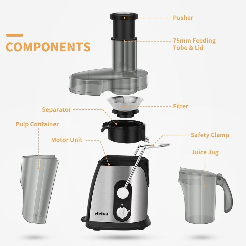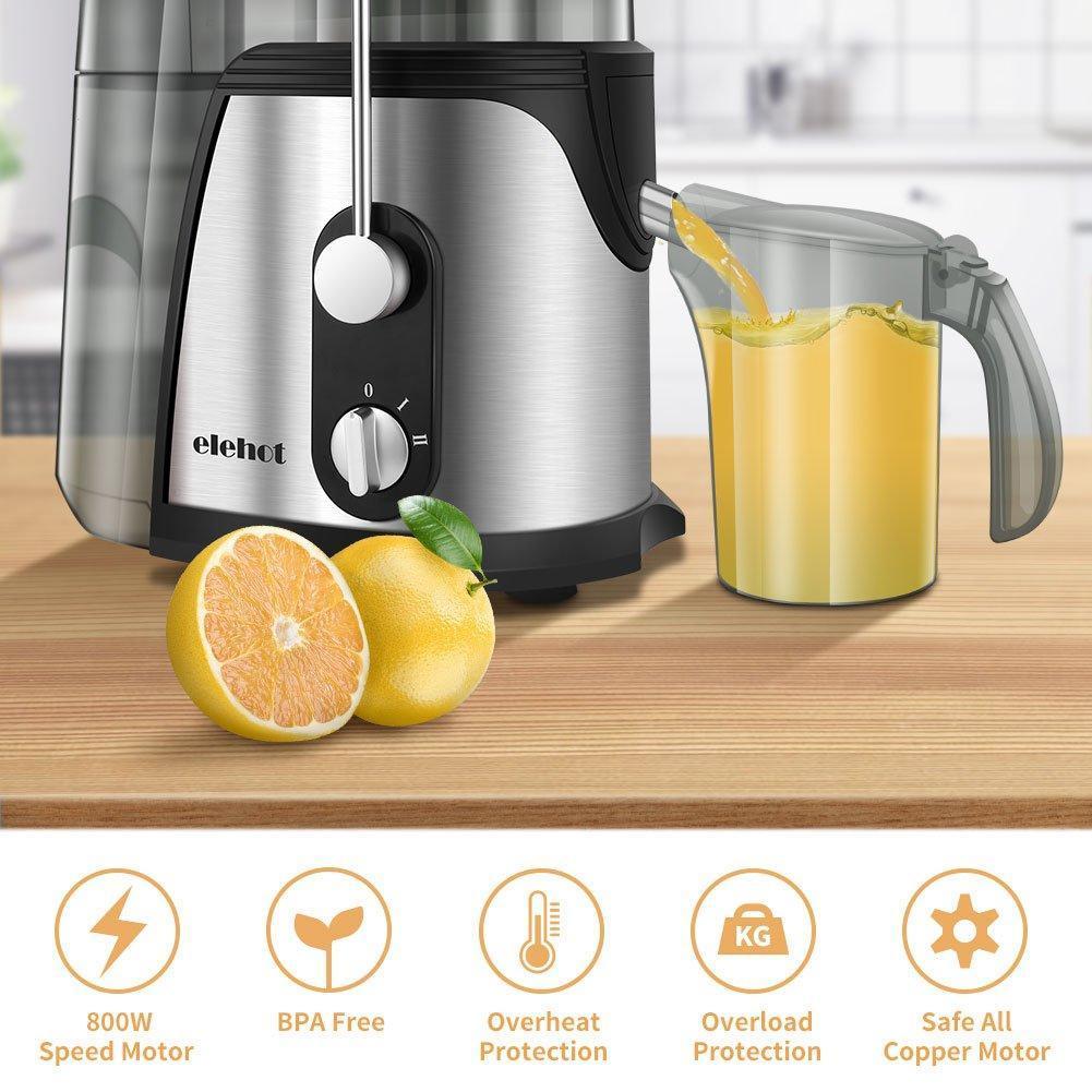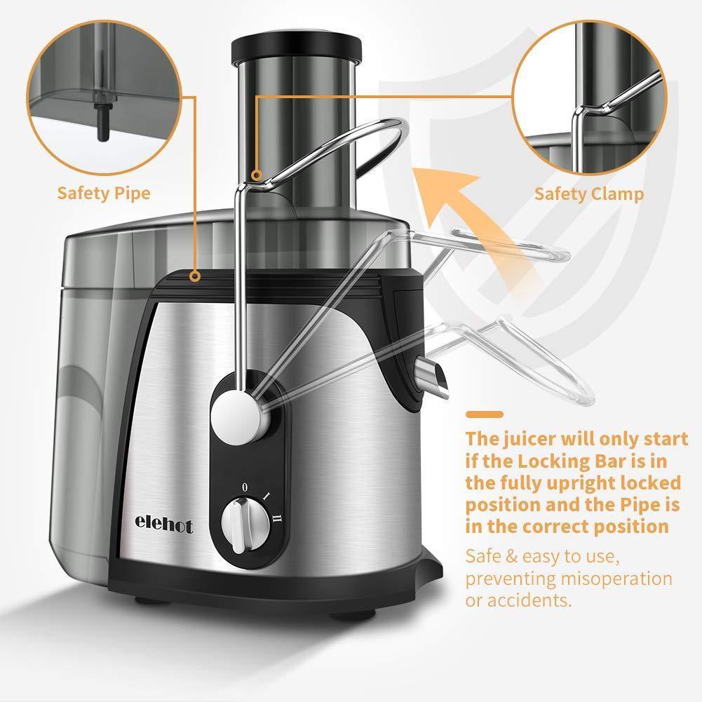 Dual-speed Modes for Fruit and Vegetable - "Ⅰ" low speed, 8000 RPM, for soft fruits like oranges, tomatoes and others; "Ⅱ" fast speed, 12000 RPM, for hard fruits like carrot, celery, beets, kale and others. Dual speed modes help extract the most juice from fruits&vegetables. BPA Free Food Grade Stainless Steel Cutting Plate - Sharp 80°inclined blades bring less pulp residue, more easy to clean. ELEHOT juicer extracts up to 25% more juice and 30% more vitamins and minerals than other juicers. Enjoy a healthier & happier lifestyle all round! Safety Clamp & Anti-drip Juice Outlet - With a safety locking clamp, it makes sure the cover is on tight while operating. Designed with anti-drip juice outlet to avoid juice come out and make a mess. Overload Protection System - It efficiently prevents shutting off the juicer due to motor overheating, unstable power supply, improper assembly, idle run, etc.