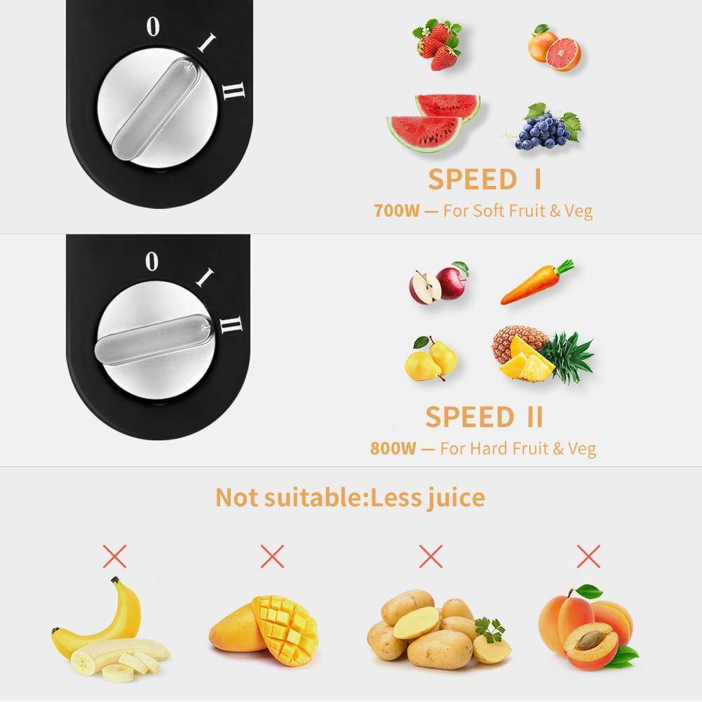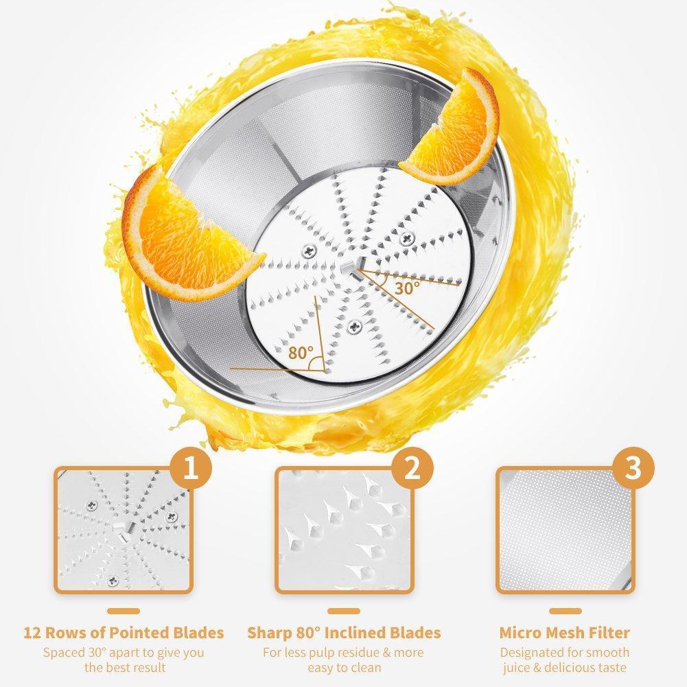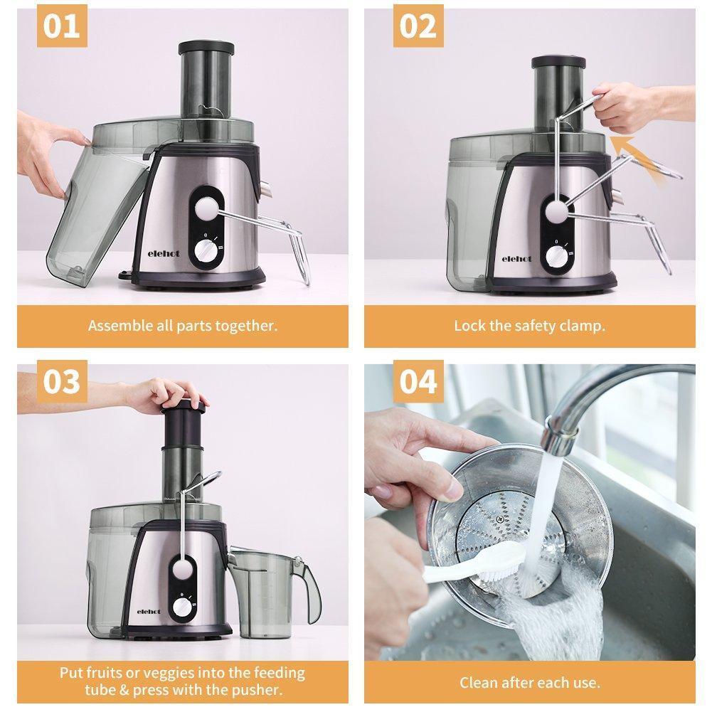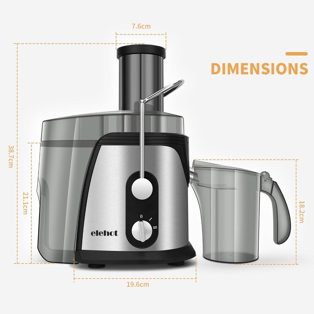 Dual-speed Modes for Fruit and Vegetable - "Ⅰ" low speed, 8000 RPM, for soft fruits like oranges, tomatoes and others; "Ⅱ" fast speed, 12000 RPM, for hard fruits like carrot, celery, beets, kale and others. Dual speed modes help extract the most juice from fruits&vegetables. BPA Free Food Grade Stainless Steel Cutting Plate - Sharp 80°inclined blades bring less pulp residue, more easy to clean. ELEHOT juicer extracts up to 25% more juice and 30% more vitamins and minerals than other juicers. Enjoy a healthier & happier lifestyle all round! Safety Clamp & Anti-drip Juice Outlet - With a safety locking clamp, it makes sure the cover is on tight while operating. Designed with anti-drip juice outlet to avoid juice come out and make a mess. Overload Protection System - It efficiently prevents shutting off the juicer due to motor overheating, unstable power supply, improper assembly, idle run, etc.
