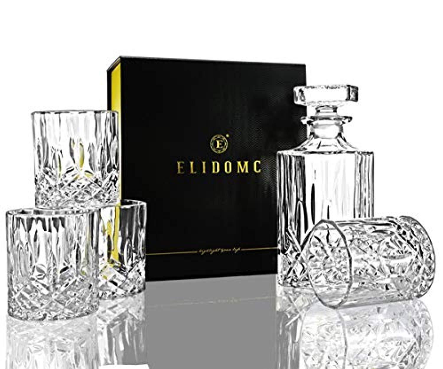 ELIDOMC 5PC Italian Crafted Crystal Whiskey Decanter & Whiskey Glasses Set, Crystal Decanter Set With 4 Whiskey Glasses, 100% Lead Free Whiskey Glass Set