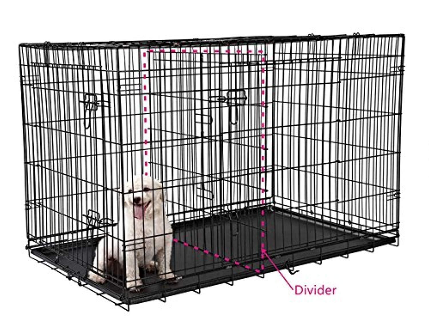 Size: 24" long x 18" wide x 20" high; the 24" crate is 1" wider and 1" higher than most other brand 24" crates that are 24"L x 17"W x 19"H, so the dog crate makes your dog feel more spacious; folding suitcase style crate, fully assembled; set-up and fold-down in seconds, no tools needed A front, a side and a back door for convenience; two bolt latches with self-locking function on each door for safety; a removable divider for puppy training
