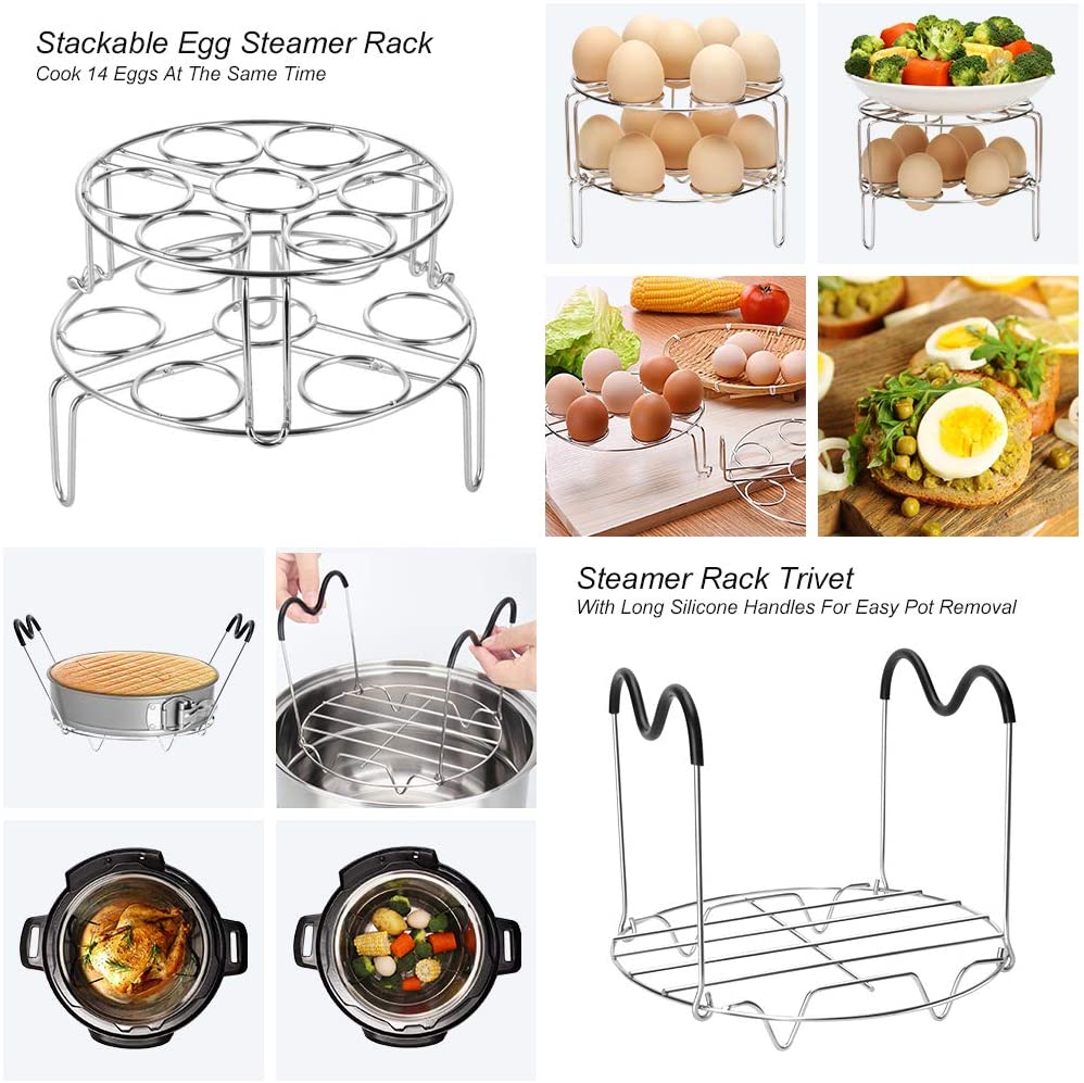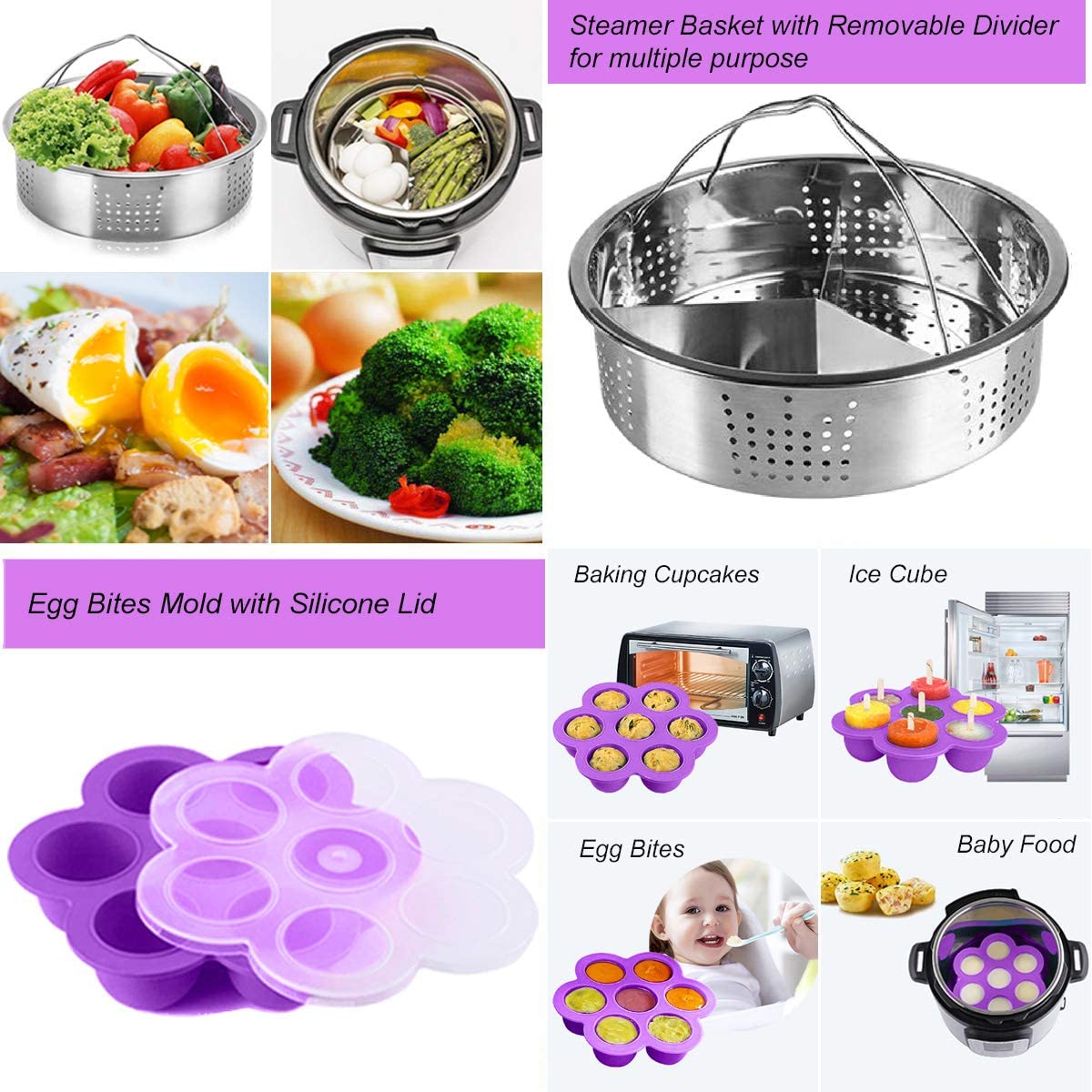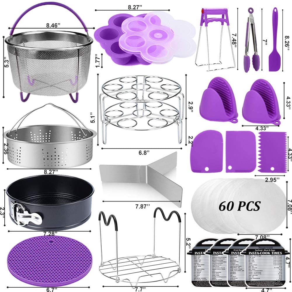 22 PCS INSTANT ACCESSORIES KIT - Includes 2 steamer baskets with 1 removable divider, 1 springform pan, 1 egg bites mold, 1 stackable egg steamer rack, 1 steamer rack trivet with long handle, 1 silicone kitchen tong, 1 dish clip, 1 silicone spatula, 2 oven mitts, 1 silicone trivet mat, 60 pcs parchment papers, 3 icing smoothers, 4 magnetic cheat sheets.MULTI-FUNCTION COOKING PURPOSE - Make delicious eggs, chicken broth, vegetables, asparagus, meat with 2 steamer baskets, bake cake and lasagna in cheesecake pan, cook 14 eggs at once with egg rack, make sous vide egg bites with egg bites mold, consume 80% less fat with parchment papers, don't bother grabbing a cookbook with magnetic cheat sheets, steam rack trivet with long handles for easy pot removal, protect household surfaces with silicone mat, lift food out of pot with food tongs and mits.100% CERTIFIED QUALITY – Every piece in this pot accessory kit is made of food-grade safe materials, FDA approved, BPA free, No rust, sturdy and durable, handy to use, easy to clean, dishwasher safe, will leave a lasting impression on your cooking and baking for years to come.WIDE APPLICATION - Works great with instant pot 6 qt 8 qt models, electric pressure cookers and other pots. Such as IP-DUO60, IP-LUX60, Ultra/Plus 6Qt, IP-DUO80, LUX80, LUX-60 V3 models and other 6,8 quart electric/stovetop pressure cooker. A welcome addition to any kitchen.BEST GIFT FOR ALL OCCASIONS - The pressure cooker accessories set is beautiful gift for all occasions whether it is birthday, Wedding, Mother Day, Christmas, Easter, Housewarming or anniversaries, you’ll all fall in love with this pot accessories Set! Comes with 100% satisfaction for a risk-free purchase.