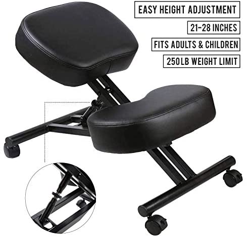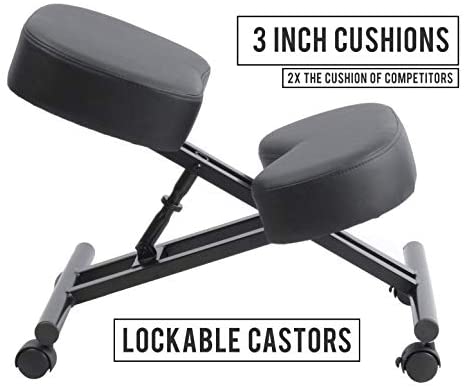 ✅RELIEVE NECK & BACK PAIN – Tired of neck and back pain from sitting on a regular chair? Defy your DESK! Our kneeling chair will make sure that you sit up straight, and relieve neck and back pain. We recommend switching between our standing desk and our kneeling chair for maximum ergonomic benefits. You’ve heard that sitting is the new smoking, so make sure when you DO sit, you sit on our kneeling chair for maximum ergonomic benefits. ✅ACHIEVE BETTER POSTURE WITH ANGLED SEAT – Hunching over at your computer for hours on end? Most kneeling chairs don’t angle their seat, and therefore, giving no real ergonomic benefit. Our Defy Desk kneeling chair gives the PERFECT angle to distribute your weight evenly throughout your body, in addition to three-inch foam cushion pads so your back stays straight & aligned and your knees, shins, and bum are comfortable all day. ✅COMFORTABLE MODERN DESIGN (THICK CUSHIONS) With a strong black metal base built to last, sleek THREE INCH foam cushion to keep you comfortable all day, and 4 castor rolling wheels with brakes to keep you moving freely, you will love your new kneeling chair. Our heavy duty and sturdy construction chair also supports up to 250lb, yet blending nicely into your home, office, or classroom. ✅MULTIPLE HEIGHT ADJUSTMENTS – With multiple height adjustable positions, our Defy Desk kneeling chair desk stool makes sure that you find your correct sitting position. Whether you are buying this for your children, or for an adult, the range from 21 to 28 inches provides enough adjustments to accommodate everyone. Ready to DEFY the normal way of sitting down at your desk? ✅100% MONEY-BACK GUARANTEE – Defy Desk products are backed by a 100% guarantee that you are fully satisfied with your product or receive your money back. Please contact us if you experience any issues, because customer satisfaction is our #1 policy!