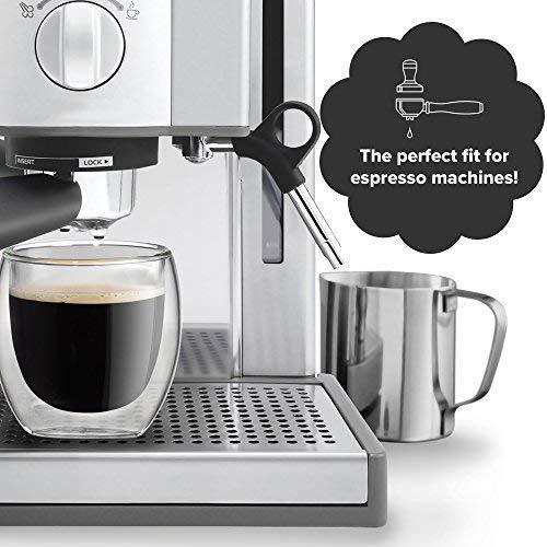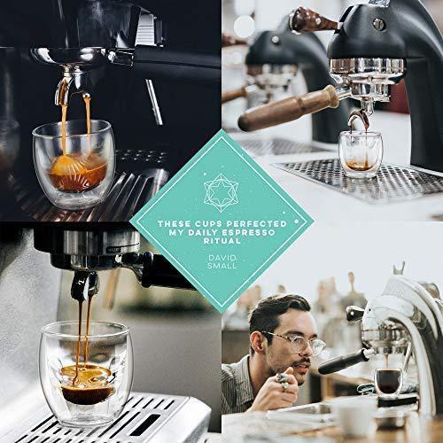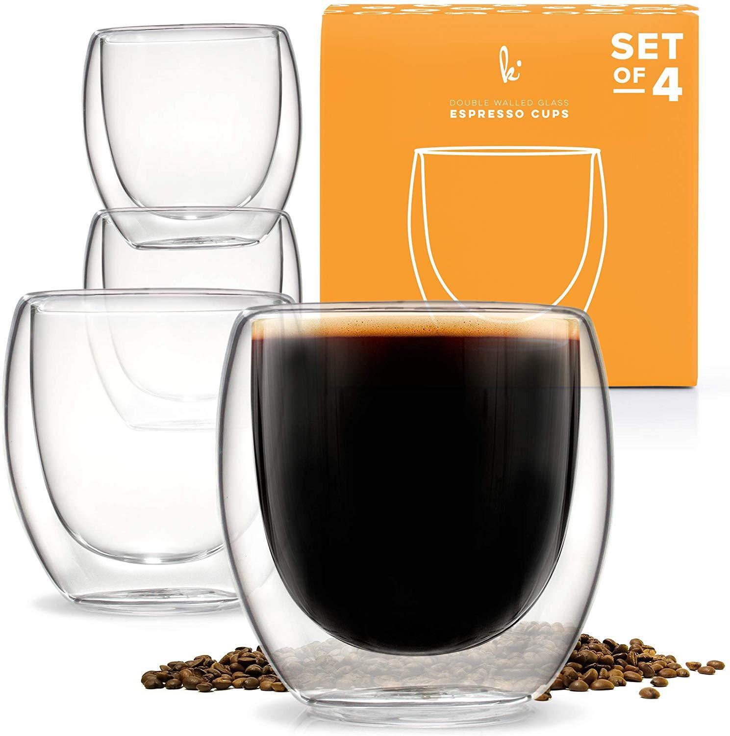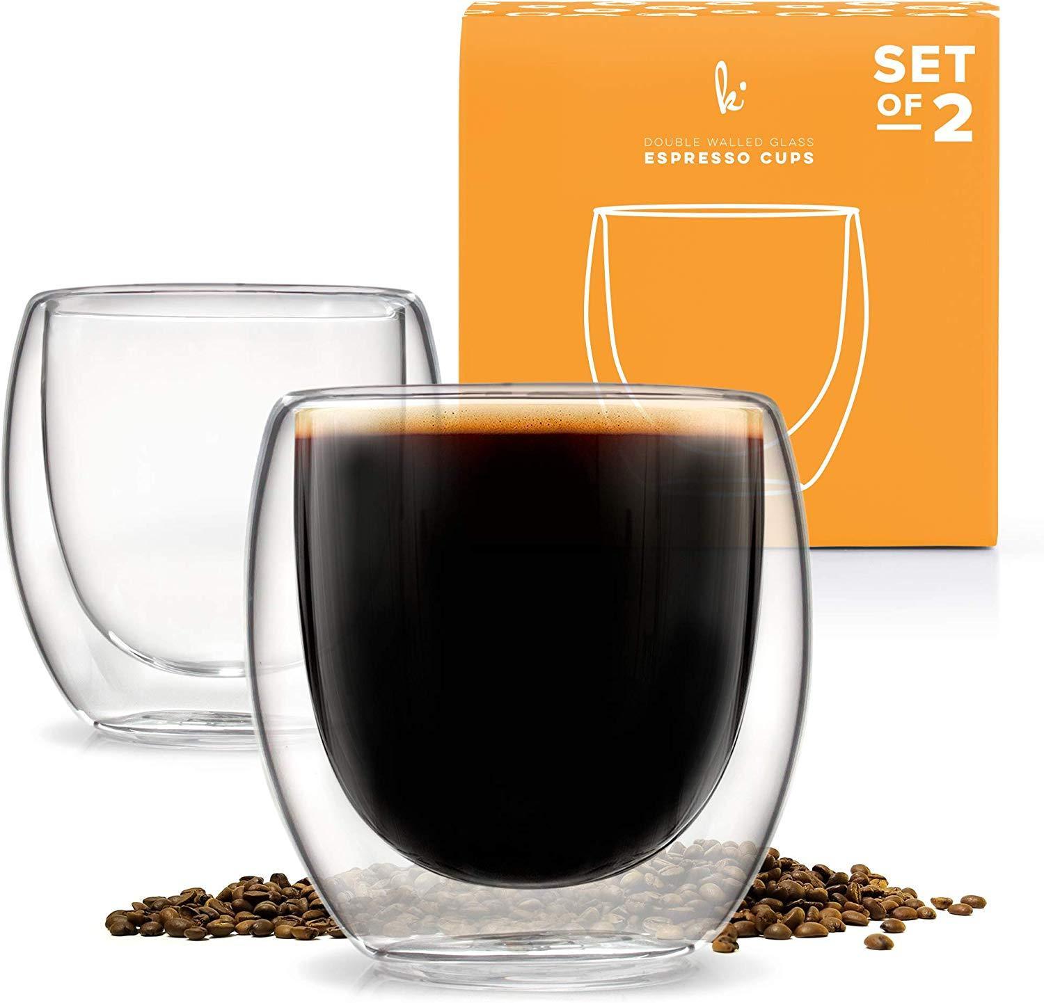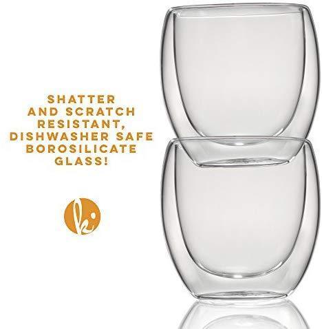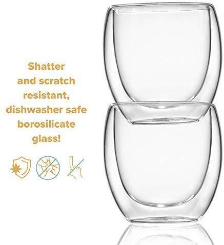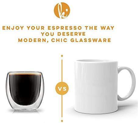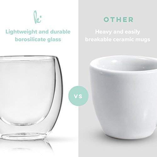 NEVER BURN YOUR FINGERS AGAIN. Our special double wall thermo insulated design prevents side heat transfer, maintaining the ideal temperature EASY TO CLEAN, BUILT TO LAST. Constructed from the highest quality borosilicate glass - dishwasher, microwave and freezer safe FOR ALL OCCASIONS. Multi-use cups to serve the perfect espresso, spirits, lungo, latte, cappuccino, tea or dessert FITS UNDER MOST ESPRESSO MACHINES. Small enough to fit under the portafilter yet large enough to hold a double shot of coffee - 2.7 oz capacity to the rim TRUSTED BY COFFEE LOVERS WORLDWIDE. Buying from Kitchables gets you a lifetime 100% manufacturer's warranty, no kidding. If you're not satisfied, you get your money back