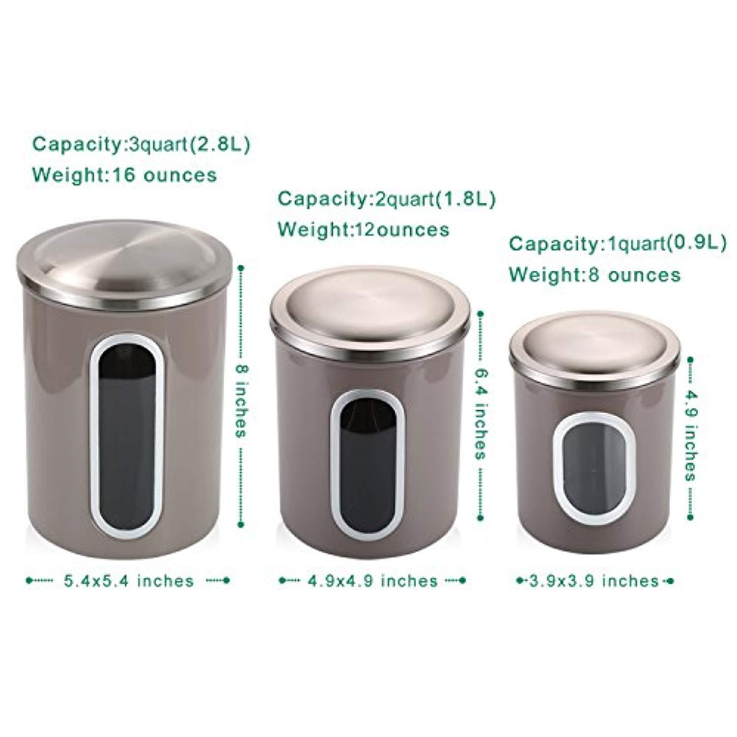 MUTI-PURPOSE USE - Kitchen canister set included 3 different size: one 3.9*3.9*4.9 inches, one 4.9*4.9*6.4 inches, one 5.4*5.4*8.0 inches, enable you to store nuts, beans, tea, sugar, coffee, and more. Perfect for Kitchen Organizing and Countertop Food Storage. NICE SEALABILITY - Silicone ring makes the lid close tightly, which ensure inside food of the container is safely kept and stay fresh. SEE-THROUGH WINDOW - The vertical windows on each canister allow for easy viewing of contents, you do not need to guess! PREMIUM QUALITY - Constructed of durable steel with a gloss powder coat finish, the sleek, not easy to deformation or abrasion, easy to clean. Stylish design makes an appealing statement on your kitchen countertop. WARRANTY - 5-years warranty, if you're not completely satisfied with your purchase of these high quality canisters sets for the kitchen, simply let us know and you'll be offered a replacement.