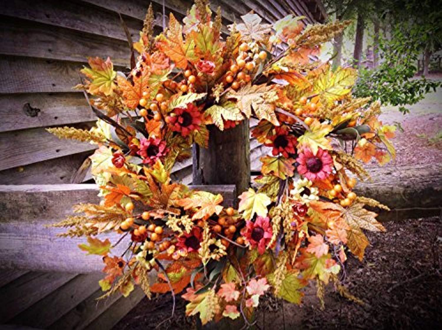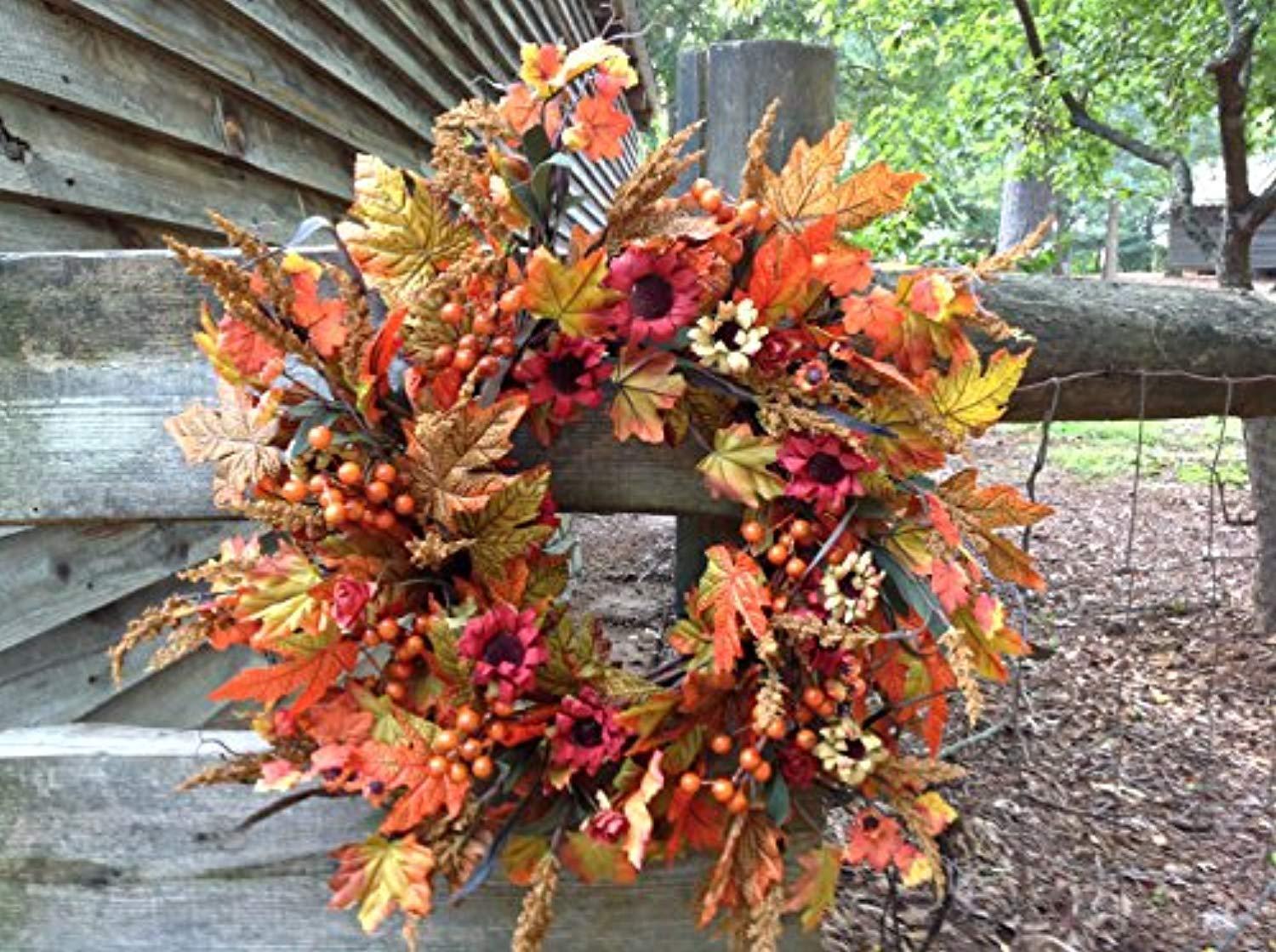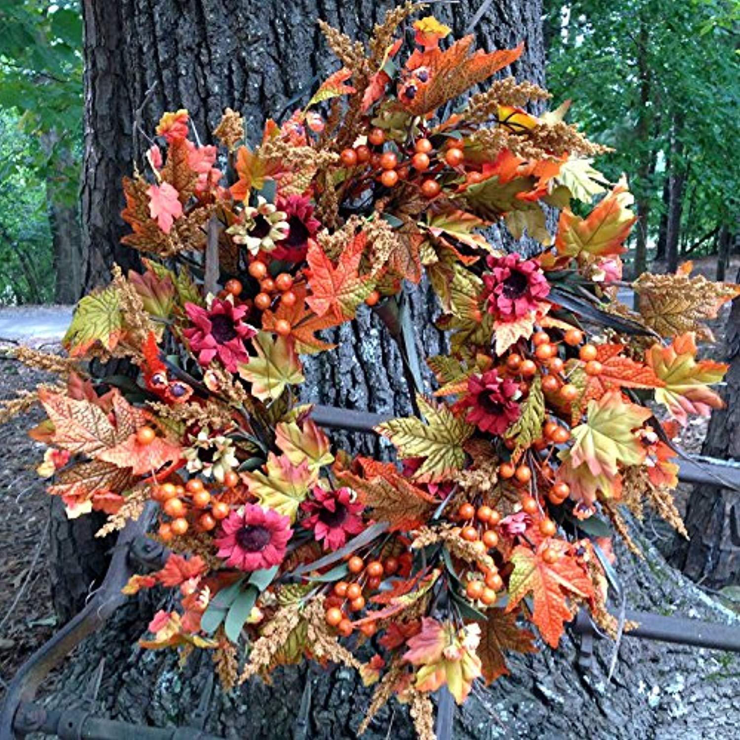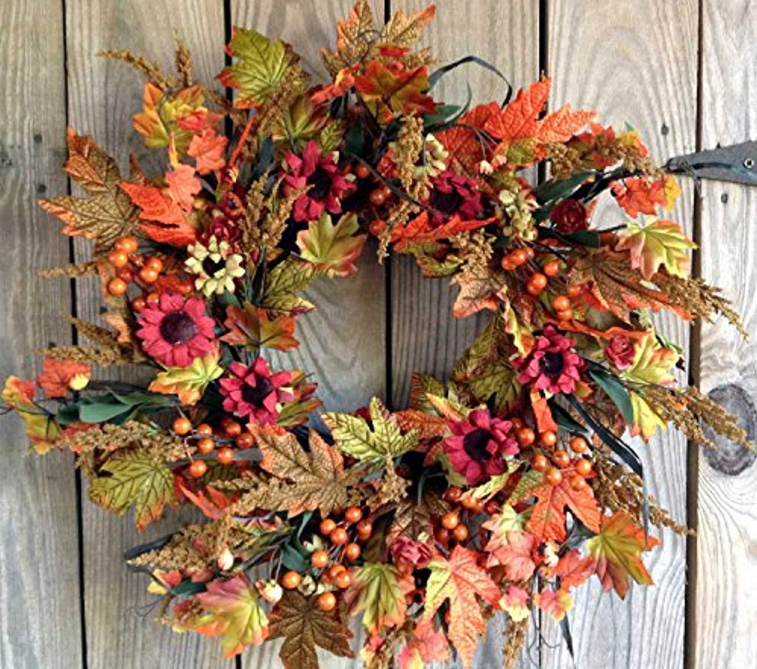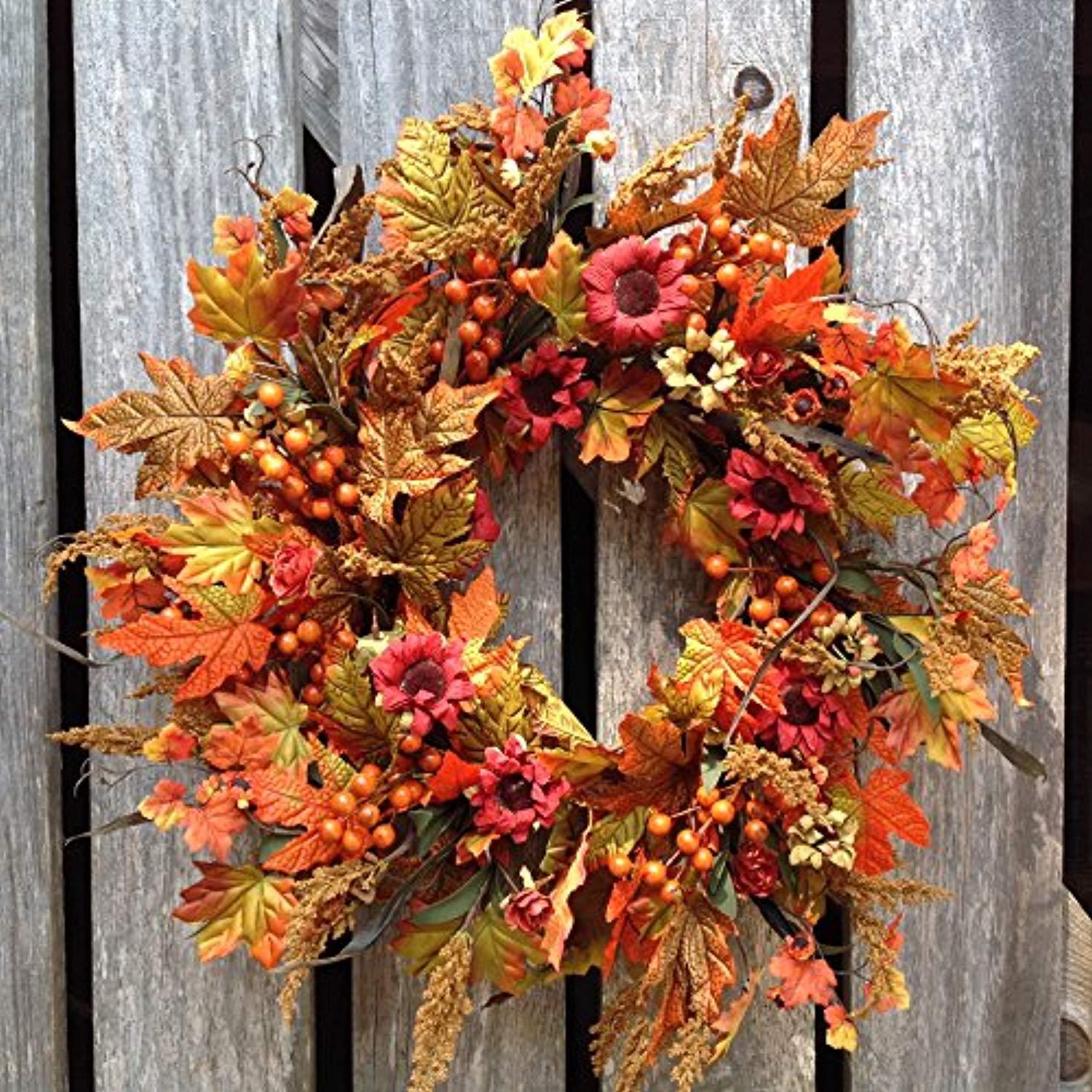 Stunning Fall Harvest Wreath - 28" Beautiful Combination of Fall Colored Leaves, Orange Berries and Small Sunflowers Great Fall Wreath built on a Saturday Metal Wire Base Sturdy Wreath that will Last for Year of Enjoyment Suitable For Indoor Use Only