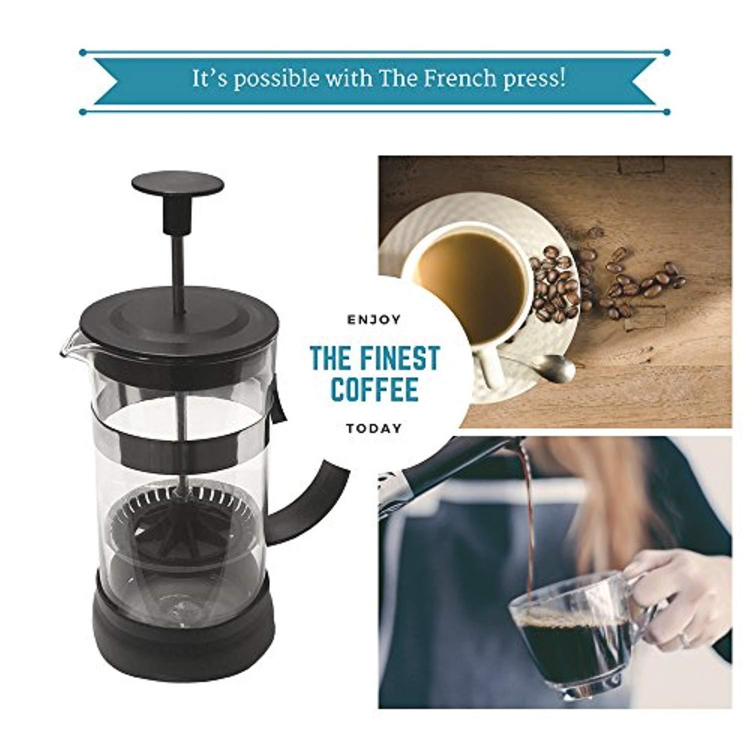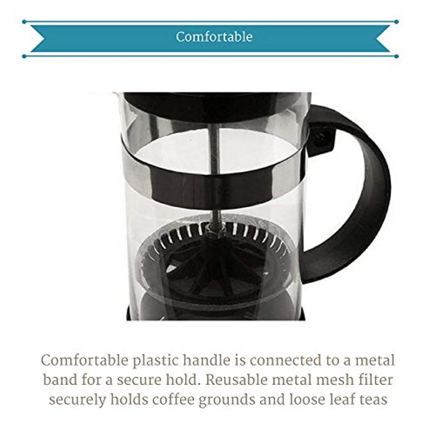 Perfect for your morning cup of coffee or tea Classic, durable design with a glass beaker encased in a protective plastic exterior for added strength Comfortable plastic handle is connected to a metal band for a secure hold Reusable metal mesh filter securely holds coffee grounds and loose leaf teas Holds approximately 12 ounces