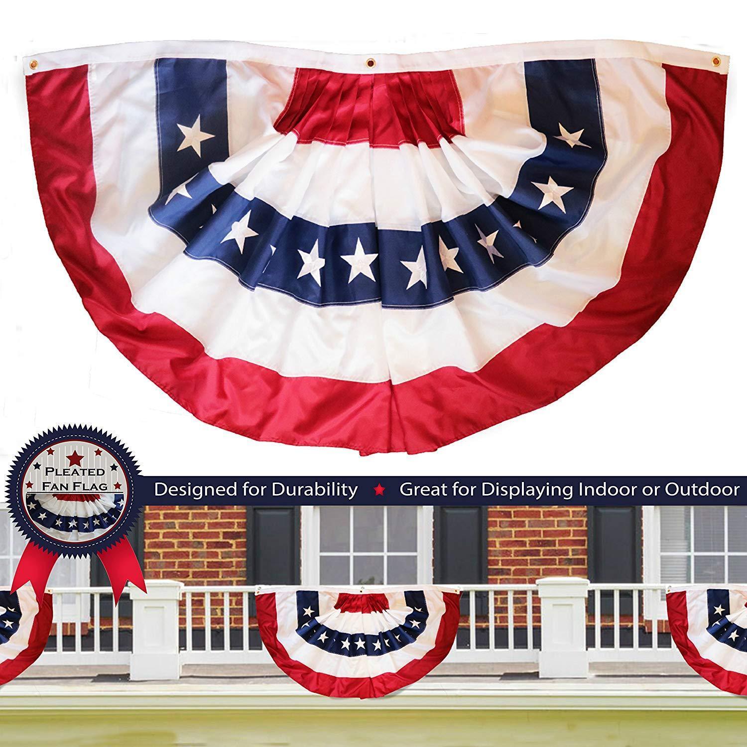 DESIGNED FOR DURABILITY: This pleated bunting American fan flag is made of waterproof 210D Polyester with 3 heavy-duty brass grommets. It is great for displaying indoor or hanging for outdoor use.
