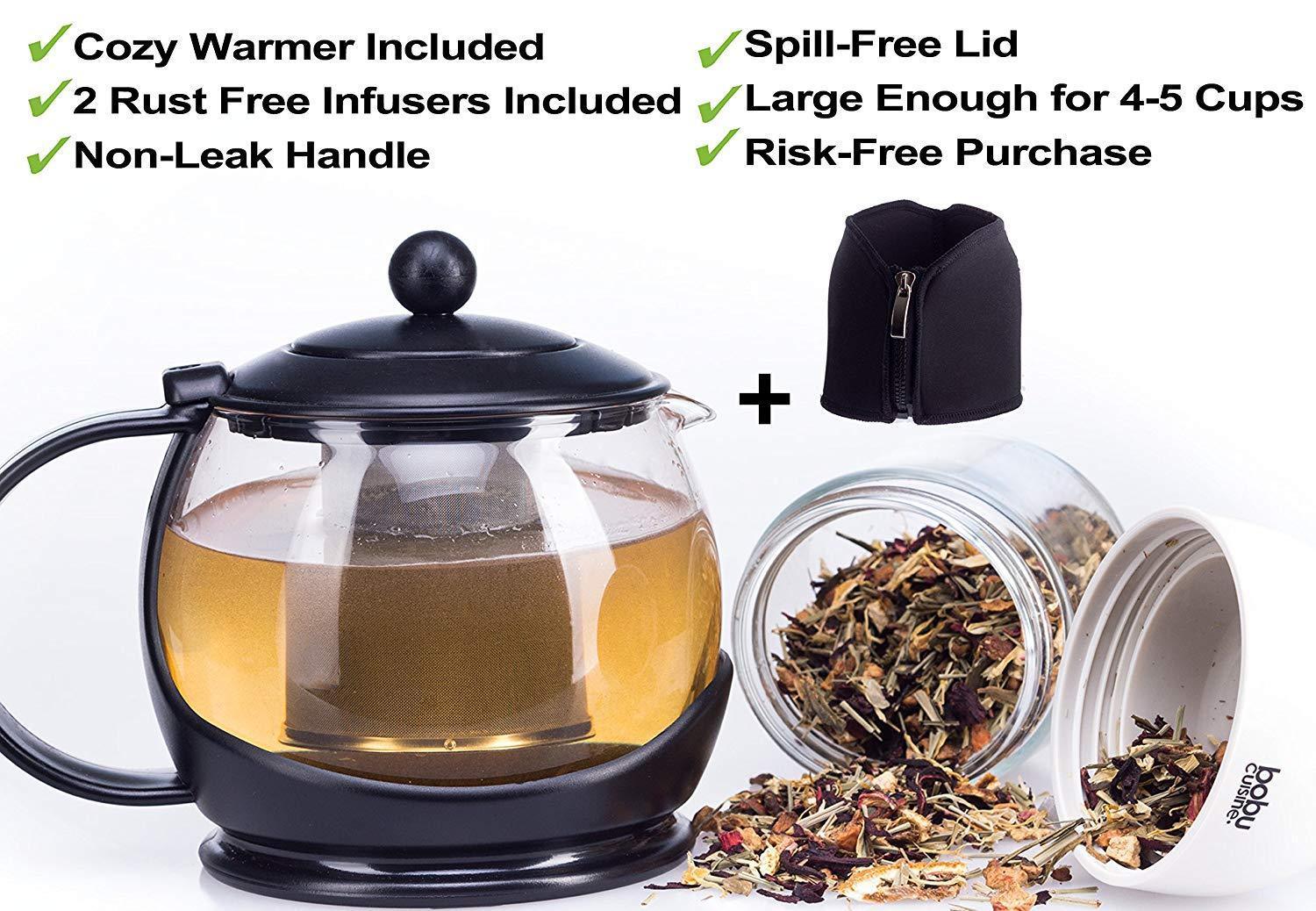 LARGE ENOUGH FOR 4 TO 5 CUPS - The perfect kitchen accessory for hosting guests or brewing up custom cups. SPILL-FREE LID - A well designed lid locks into place and ensures water doesn’t leak out of your tea maker. DURABLE, BUILT TO LAST WITH 2 RUST FREE INFUSERS INCLUDED – made of borosilicate glass that is heatproof, sturdy and lightweight. An extra infuser is included in every purchase to ensure years of use. The teapot is easy to wipe, clean and table. The removable 18/8 stainless steel mesh infuser is rust-free and allows you to steep any type of loose tea leaves and brew your tea to any desired strength TEAPOT FOR THE MODERN HOME – Looks beautiful on your table it has an insulated, sturdy black frame made. Easy to wipe clean and durable for many years of delicious cups of tea. This unique design allows you to see the tea changing colors. STYLISH MATCHING BLACK TEA COZY KEEPS YOUR TEA WARM - No need for reheating. Keeps your glass teapot warmer for hours. It has a chic design, it resists stains and odors plus it's dishwasher safe and easy to clean. BEAUTIFUL PACKAGING MAKES THE PERFECT GIFT. The teapotr comes in an elegant white box that makes it very presentable, with an emphasis on beauty and practicality. It is a great gift for both men and women, for any occasion; housewarming, weddings, birthdays, office gifts, Christmas, stocking stuffers etc. YOUR FAVORITE TEAPOT OR YOUR MONEY BACK - We pride ourselves on offering amazing products and back that up. We know you'll love our modern teapot and that’s why we can offer a 100% refund if you’re not satisfied - NO QUESTIONS ASKED. We care deeply for our customers and make YOU our top priority. ORDER 100% Risk free