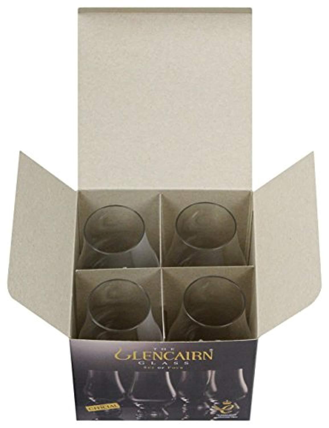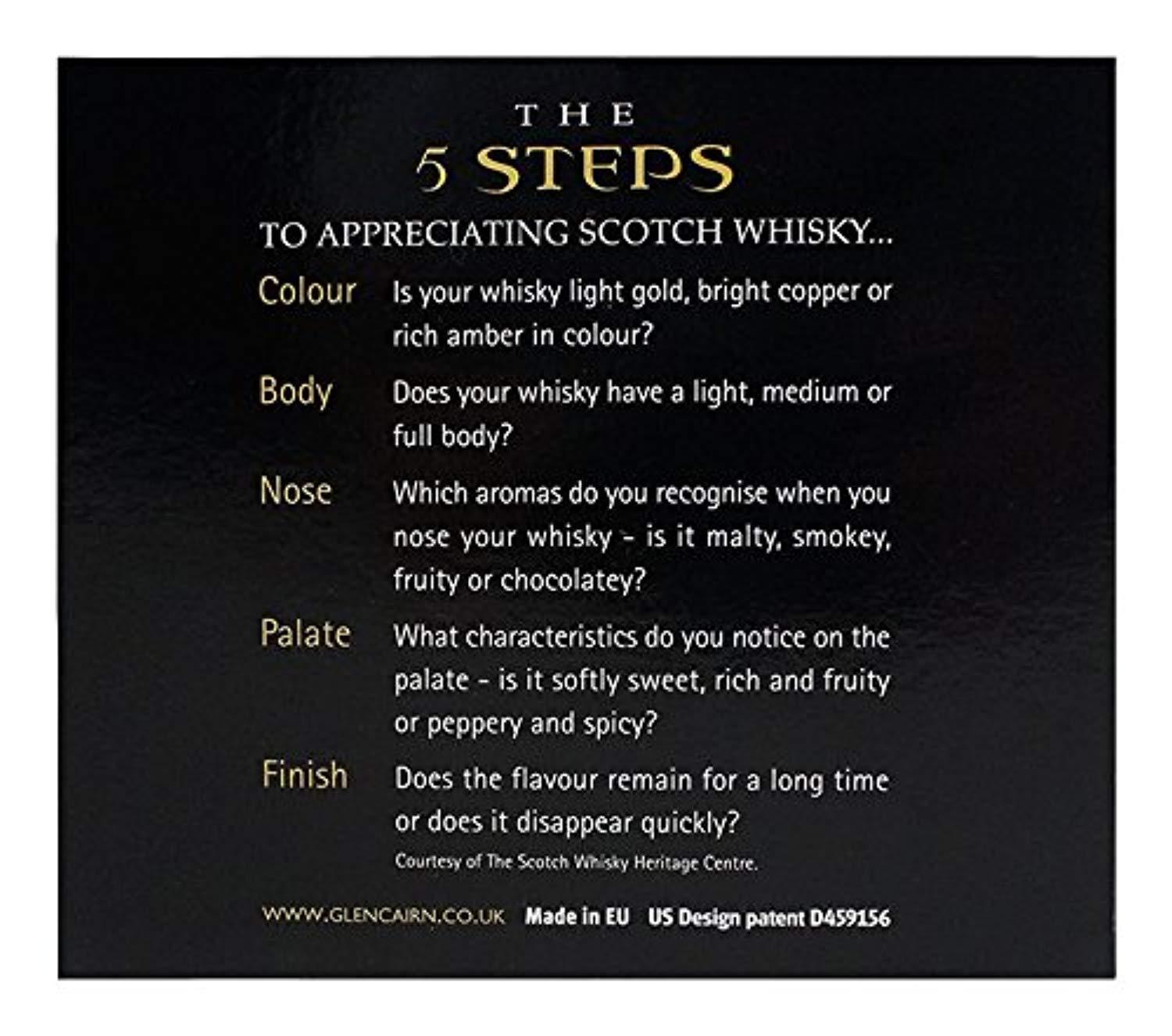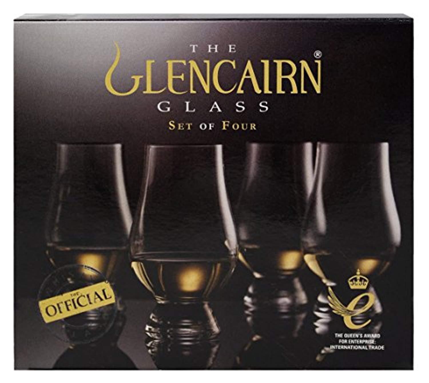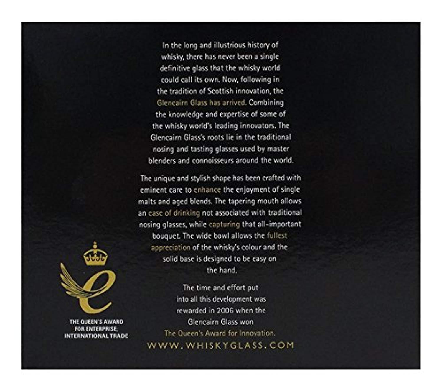 You will receive (1) Gift Case of (4) Glencairn Crystal Whiskey Tasting Glasses Winner of the 2006 Queen's Award for Innovation Tapering mouth allows an ease of drinking Wide bowl for the fullest appreciation of color and aroma The Official Whiskey Glass, and says Glencairn on the bottom of the glass