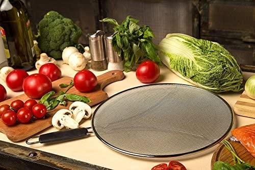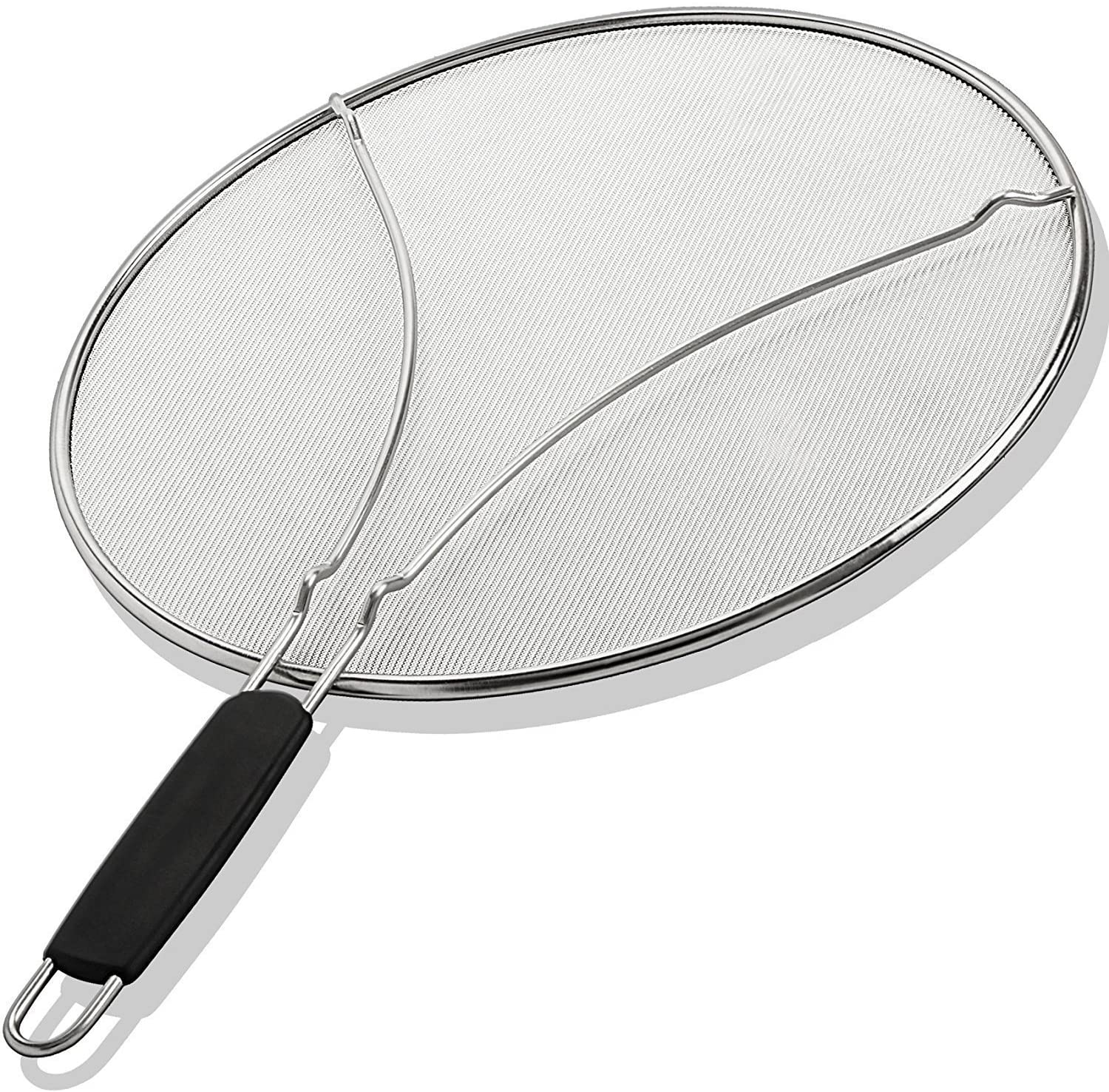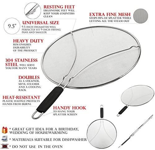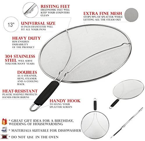 Universal size easy-to-clean multi use grease guard: The diameter of this premium splatter screen for frying pans is 13 inches, so it will fit all your pots, skillets and pans. This multipurpose kitchen tool also doubles as a strainer, steamer, and a cooling rack and stores easily in narrow spaces - Easy to clean - Rustproof - Dishwasher safe