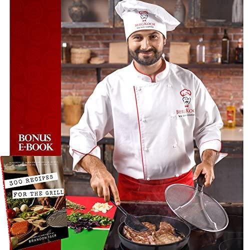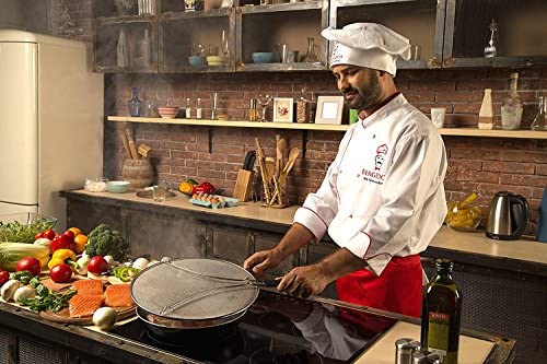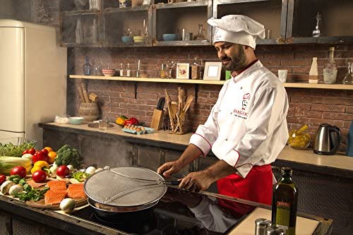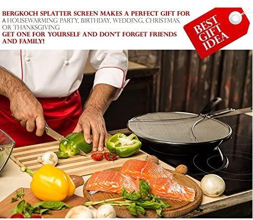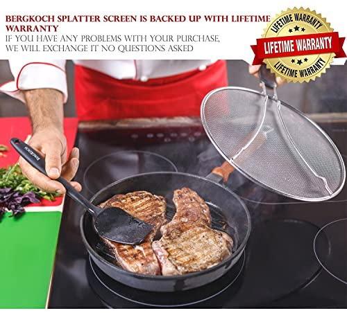 Protects from hot oil and keeps you safe: Made of 304 grade stainless steel and extra fine mesh, BergKoch splatter guard stops 99% of splash, lets all the steam out and allows you to watch the cooking process easily. Industry's leading engineers increased its mesh count by 40% and reinforced the joints to take your kitchen safety to a new level.