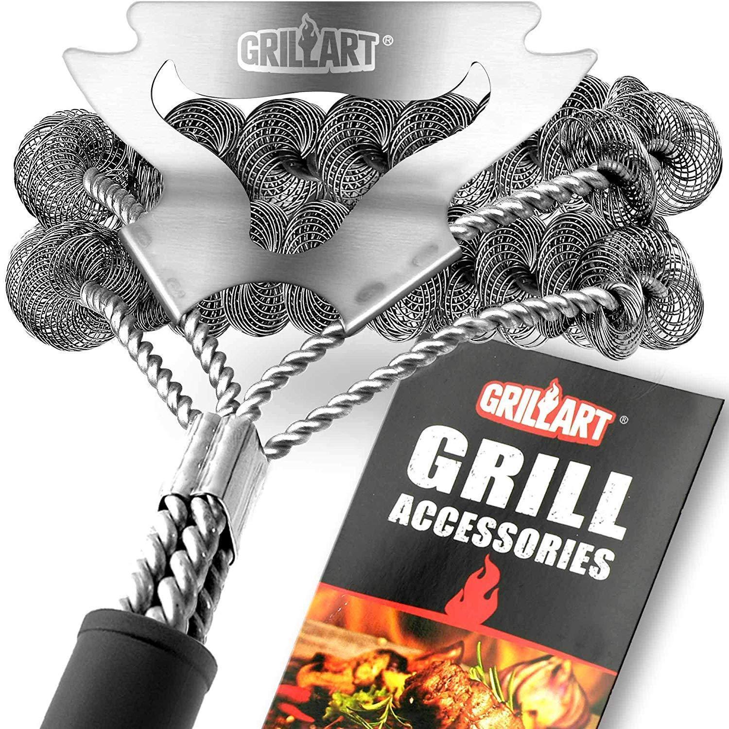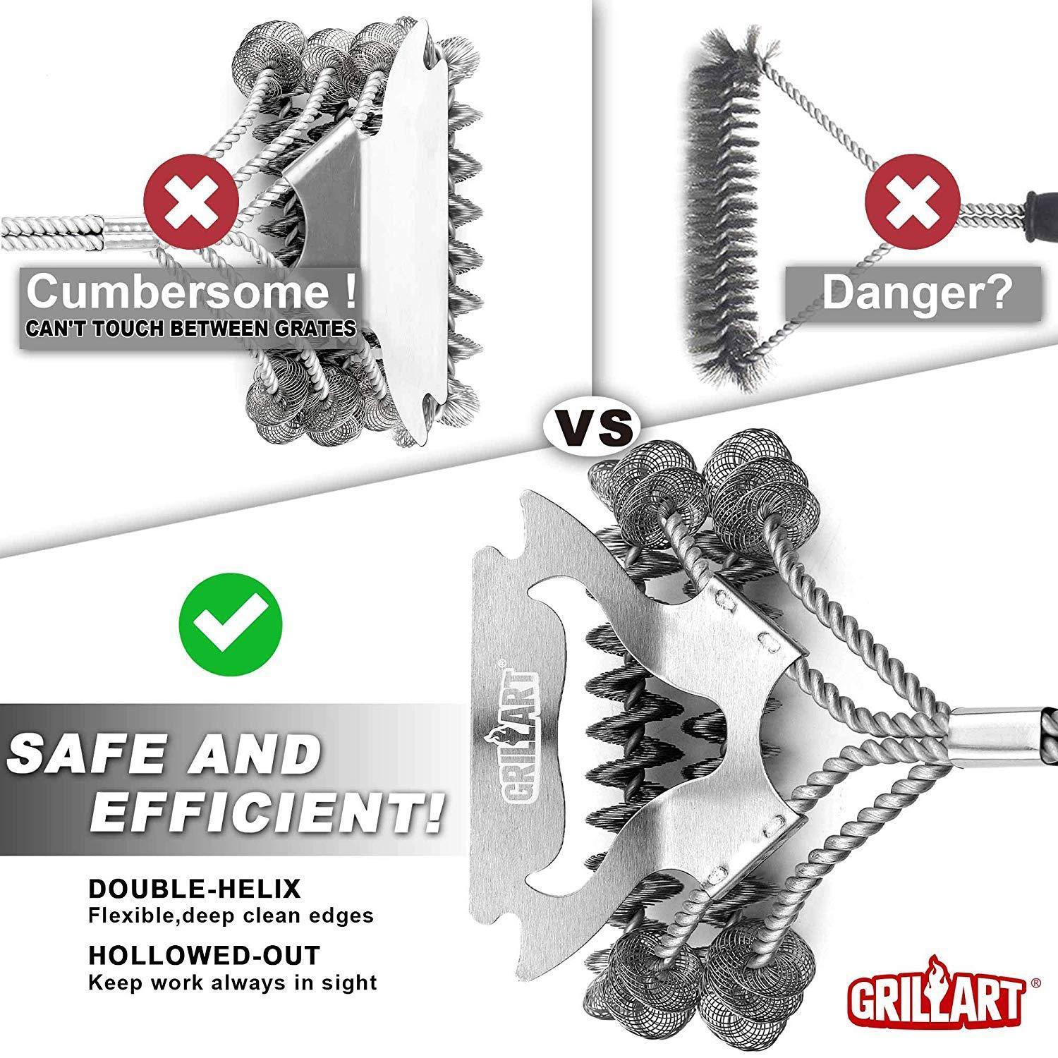 ✅【Faster Cleaning – A Hollowed-Out Scraper And 150% More Flexible Helix】: Wider scraper can effortlessly clean a larger area of stubborn stains; Hollowed-out design allows you to target the parts that have not been cleaned and tackle it directly; 150% more flexible shorter sides can be used to easily penetrate and clean between the slats of your grill. No more wasting time to force a too stiff helix to give in, leave you plenty of time to crack open a cold one and get back to the fun! ✅【Safe for all Grill Types】 - Double helix design makes the use of barbecue brush more flexible and handy, gets your grill as good as new without scratching grill coating. This grill brush and scraper is perfect for Porcelain, Ceramic, Infrared, Weber, Char-Broil, etc, but it is NOT FIT for MESH GRATES. ✅【Guaranteed to Last 5X Longer】 - Superior stainless steel makes this BBQ brush for grill impossible to rust; No bristle design makes it non bristle to wear down; Reinforced 17’’ long handle not only protect your hands from burning but makes it hardly break. The best and most reassuring gift for avid grillers. ✅ 【100% Money Back Guarantee】: You’re very welcome to contact us for a full refund or a satisfactory replacement if there’s any problem, but we’re sure this will certainly be your favorite grill cleaning brush ever! Click the ‘’Add to Cart Button Now’’. Consider getting TWO - one for you and one for your very best friend.