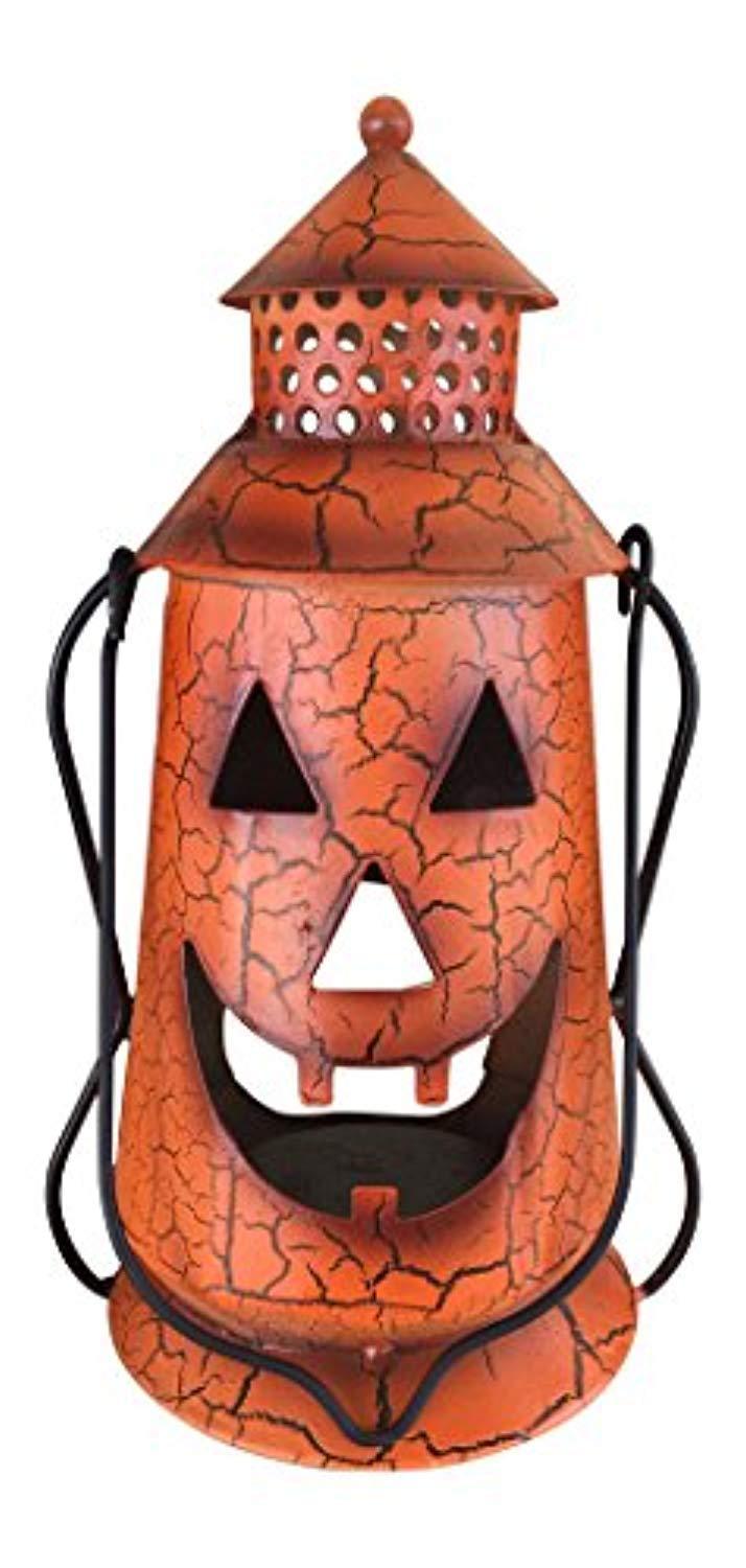 Halloween Pumpkin Rustic Lantern with Handle, - Metal Jack O Lantern Fall Decoration, Standing or Hanging, Holds Pillar Candle - Indoor, Outdoor, by Clovers Garden