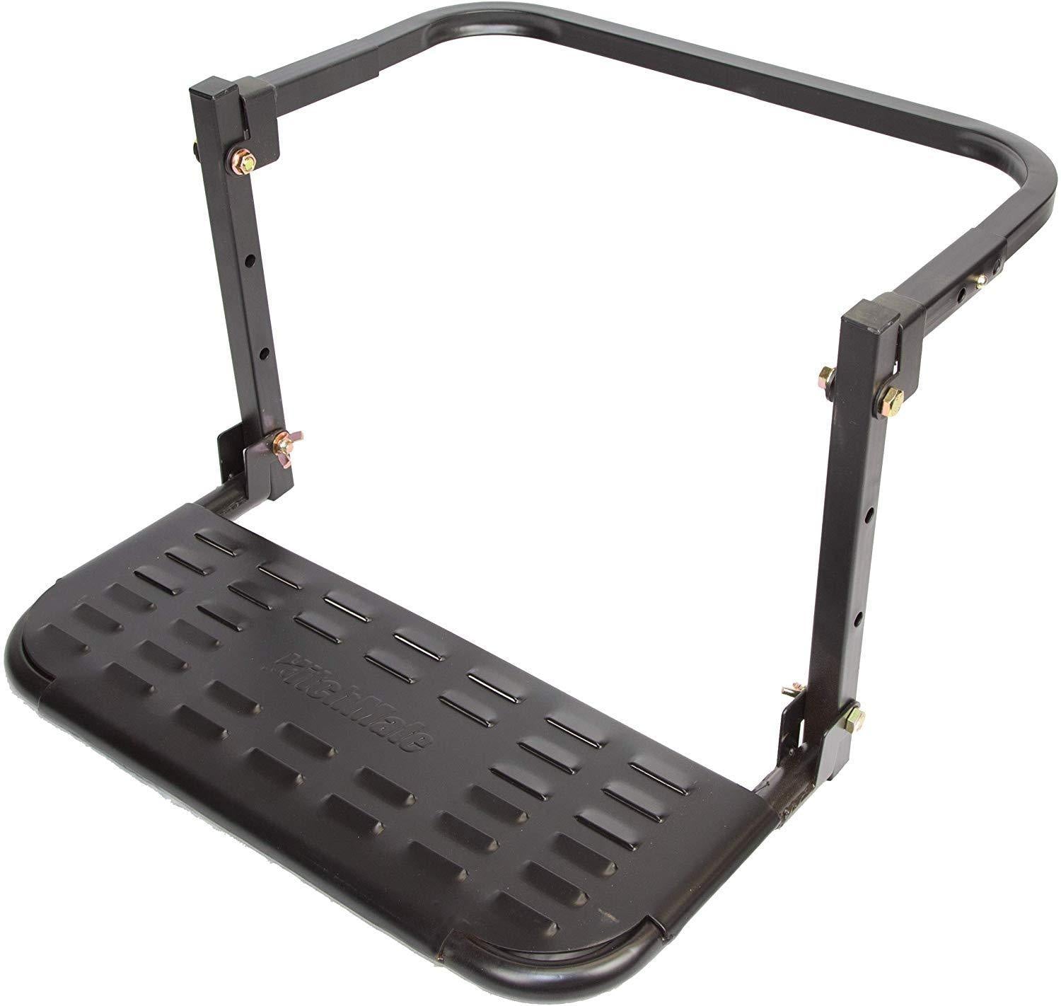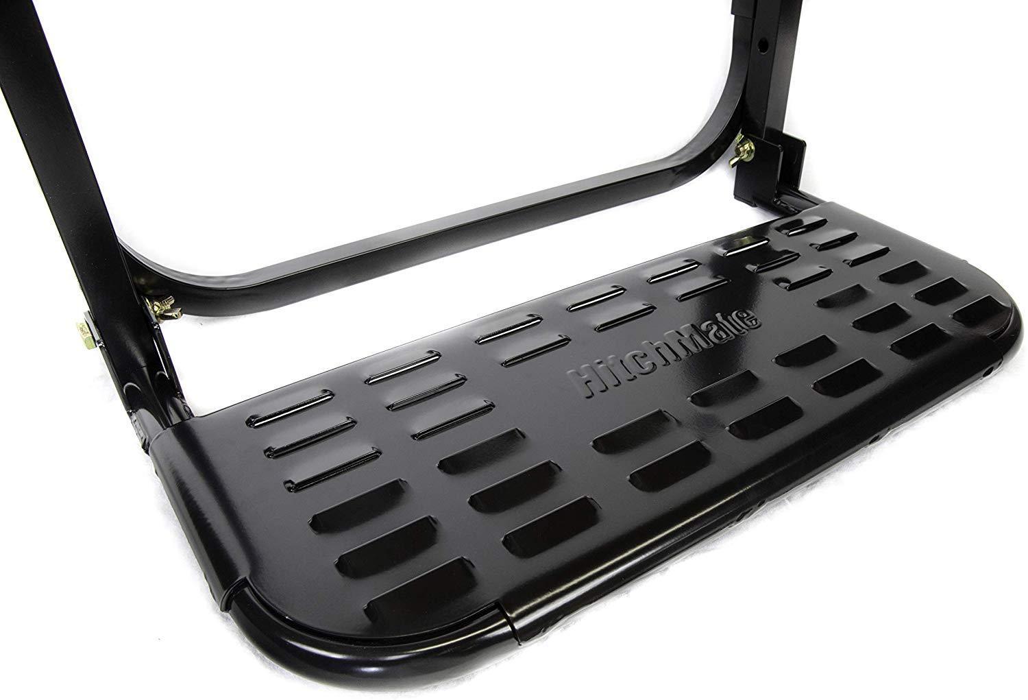 HitchMate Tire Step is a Sturdy, durable tire-mounted wheel step designed for use with SUVs, RVs and light trucks Great for working on vehicle engines, changing wiper blades, cleaning inaccessible spots and packing roof racks on tall vehicles Adjusts to three positions in both tire width and height Fits all tires up to 12.5" wide Entire unit is finished in a black powder coating, and its 22" wide x 10" deep anti-slip stepping pad holds up to 400 lbs Folds flat for easy storage and fully assembled Out of the Box!