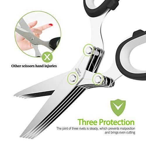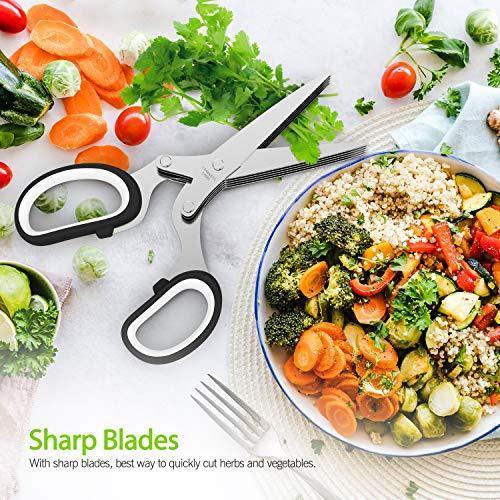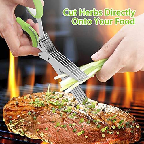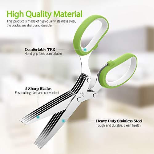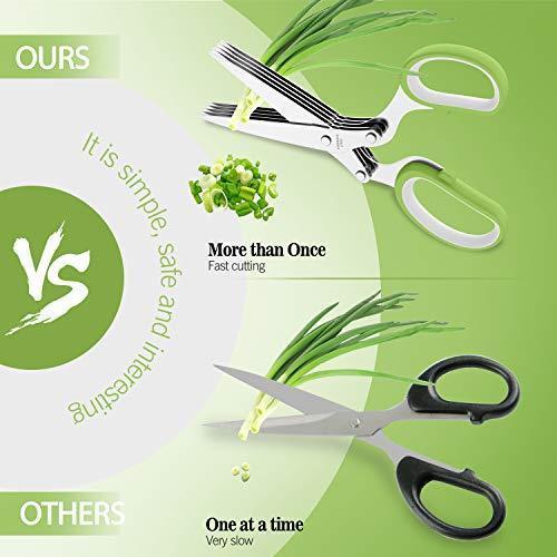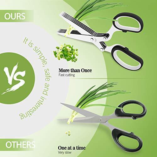 ✅ STAINLESS-STEEL 5 SHARP BLADES SHEARS - JOFUYU herb scissors, made of food grade stainless steel, 5 sharp blades fixed firmly by 3 rivets, durable and safe. Just 1 pair of scissors but installed 5 pairs of blades working at the same time, makes chopping easier and much more efficient than a knife or single blade scissors. Sharp blades make fast leaves snipping rather than crushing or messing. Guarantee no flavor losing of ingredients. ✅ ERGONOMIC & NON-SKIP HANDLE - Non-slip shredder handle made of TPR(Rubber) material. Bring you comfortable grip feeling and excellent handling without aches and numbness. Don’t be too surprised when you find can hold it tightly even with wet hands or oily fingers, It’s supposed to work effortless and safe while snipping. ✅ VERSATILE - The multifunctional 5 blades herb chopper can be used for shredding and chopping fresh mint, rosemary, sage, cilantro, parsley, basil, chives seaweed, even bread, noodle, beef jerky etc. Some customer also use it for cutting paper & cloth for art& crafts design or shred old bill and useless mail, It’s an essential gadget in your daily life. ✅ SHARP AND EASY TO USE - Our herb cutting scissors is made of high-quality stainless steel. The blades are sharp and durable with strong corrosion resistance and are not easy to rust for long-term use. ✅ 100% SATISFACTION GUARANTEE - JOFUYU team offers complete customers satisfaction. If you are not satisfied for any reason with your product, just contact us and we will replace the product or refund your order, no question asked, we always care for you.
