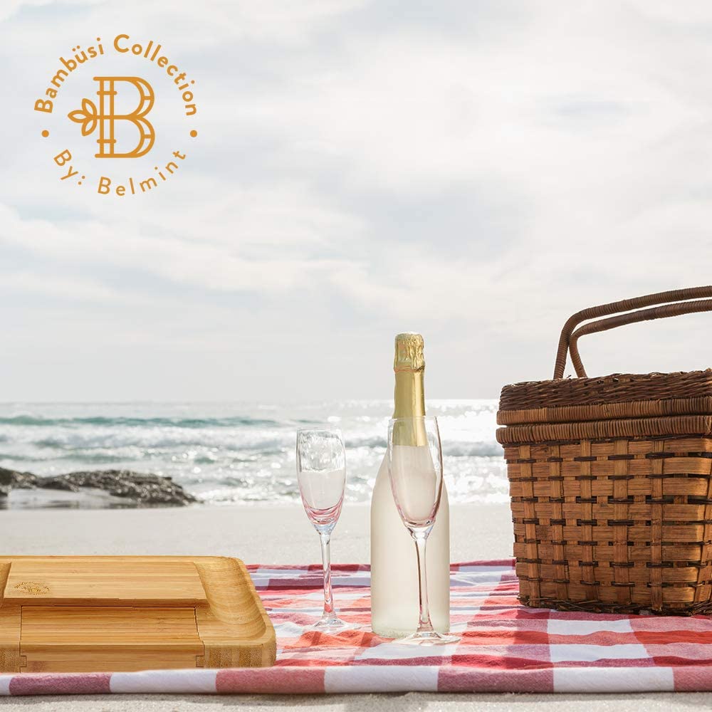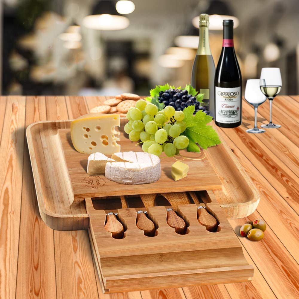 THE EXCLUSIVE CHOICE FOR SERVING CHEESE: The key to enjoy slices of Italian Ricotta, English Cheddar, or French Vacherin with a glass of wine for holiday entertaining is to have our modern bamboo cheese board. Bordered by grooves that hold crackers, nuts, or olives and designed with a hidden drawer with four utensils, cheese knife. Bamboo-crafted tray makes a perfect serving board for entertaining guests.